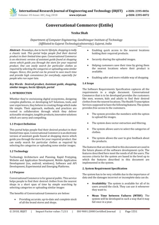 The document proposes a conversational commerce portal that helps users find desired products like clothes within a limited time span. It functions like an assistant at a shopping store, allowing users to search by category or upload similar images. The portal aims to save time for busy users. It describes the technology used, including image similarity algorithms, and outlines features like feedback. The implementation discusses tools like Eclipse, SQL Yog, and security measures. Future work includes expanding to more malls and allowing online payments.