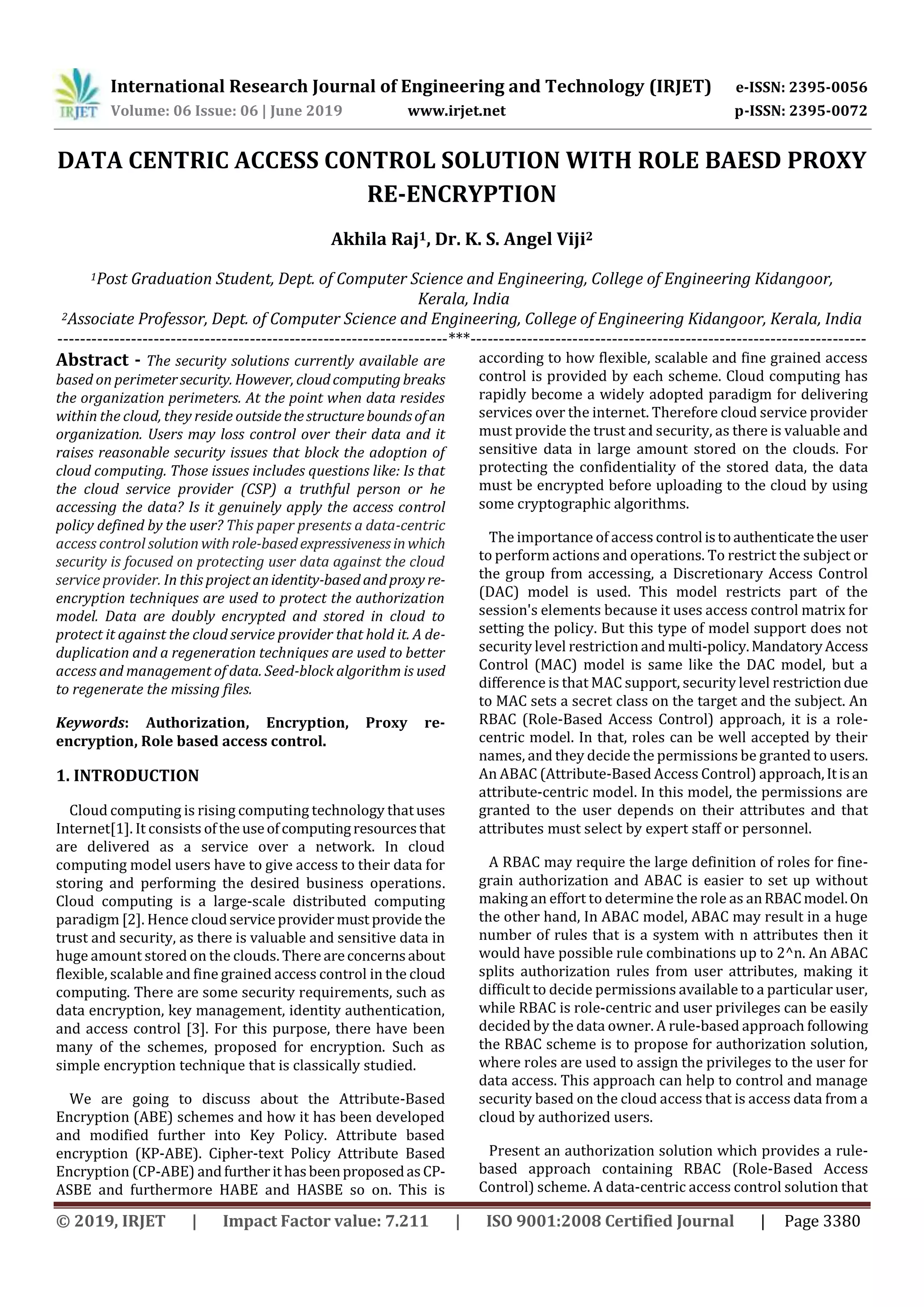 This document discusses data-centric access control solutions for cloud computing. It proposes a solution called SecRBAC that uses identity-based encryption and proxy re-encryption techniques to protect data stored in the cloud from the cloud service provider. The key aspects of SecRBAC are that data is doubly encrypted before being stored in the cloud. Also, a role-based access control approach is used to assign privileges to users to access encrypted data from the cloud.