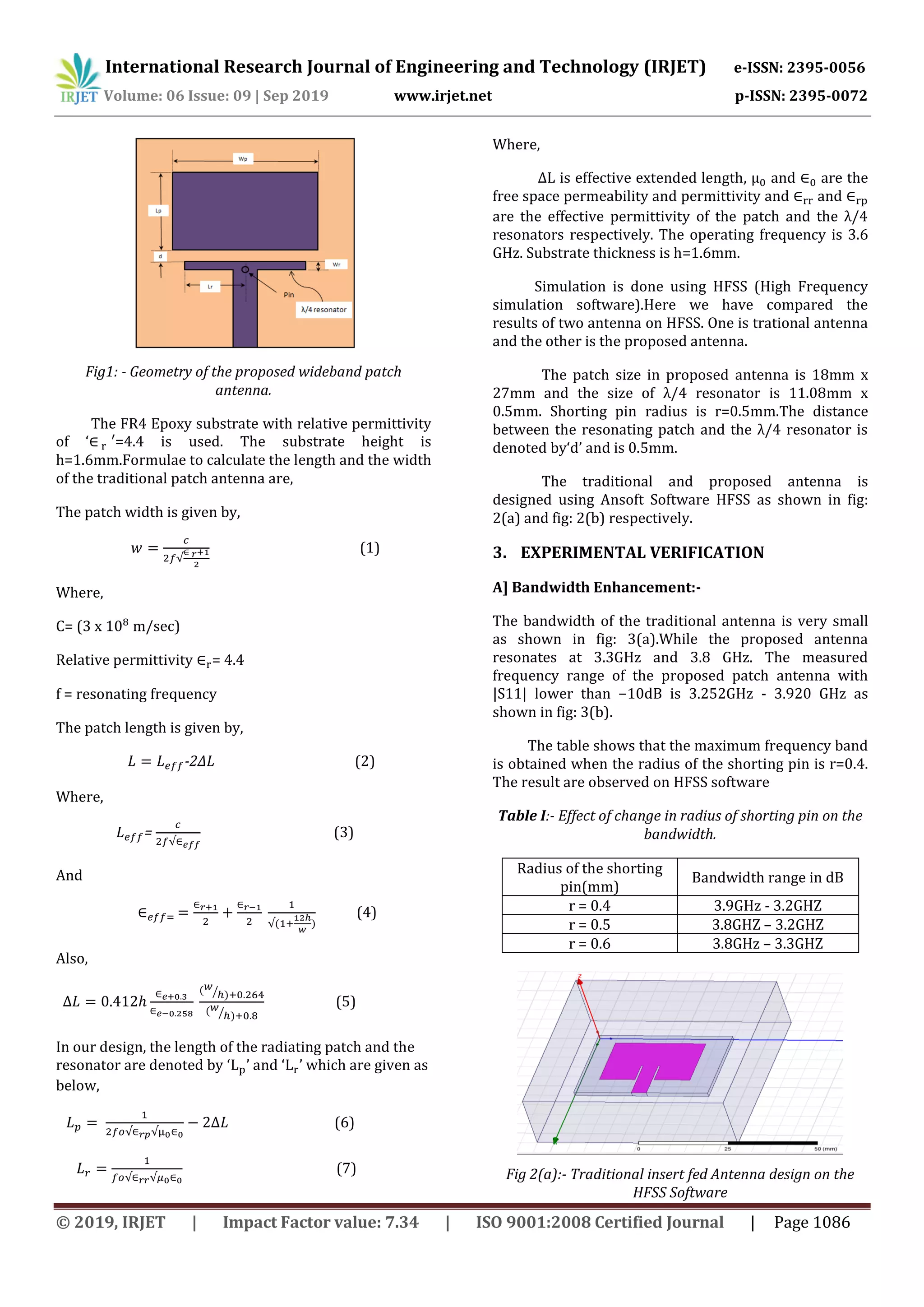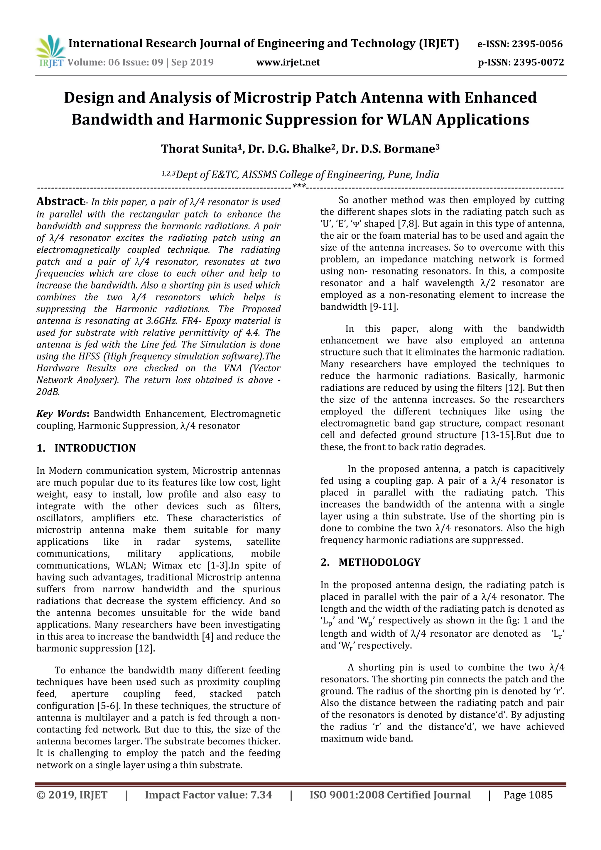The document describes a design for a microstrip patch antenna with enhanced bandwidth and harmonic suppression for WLAN applications. A pair of quarter-wavelength resonators are placed in parallel with the rectangular patch to increase bandwidth through electromagnetic coupling at two resonant frequencies. A shorting pin is used to combine the resonators and suppress harmonic radiation. Simulation results show the proposed antenna achieves over 20% bandwidth compared to a traditional patch antenna, and reduces harmonic radiation. The antenna is designed to resonate at 3.6GHz for WLAN applications using FR4 substrate.