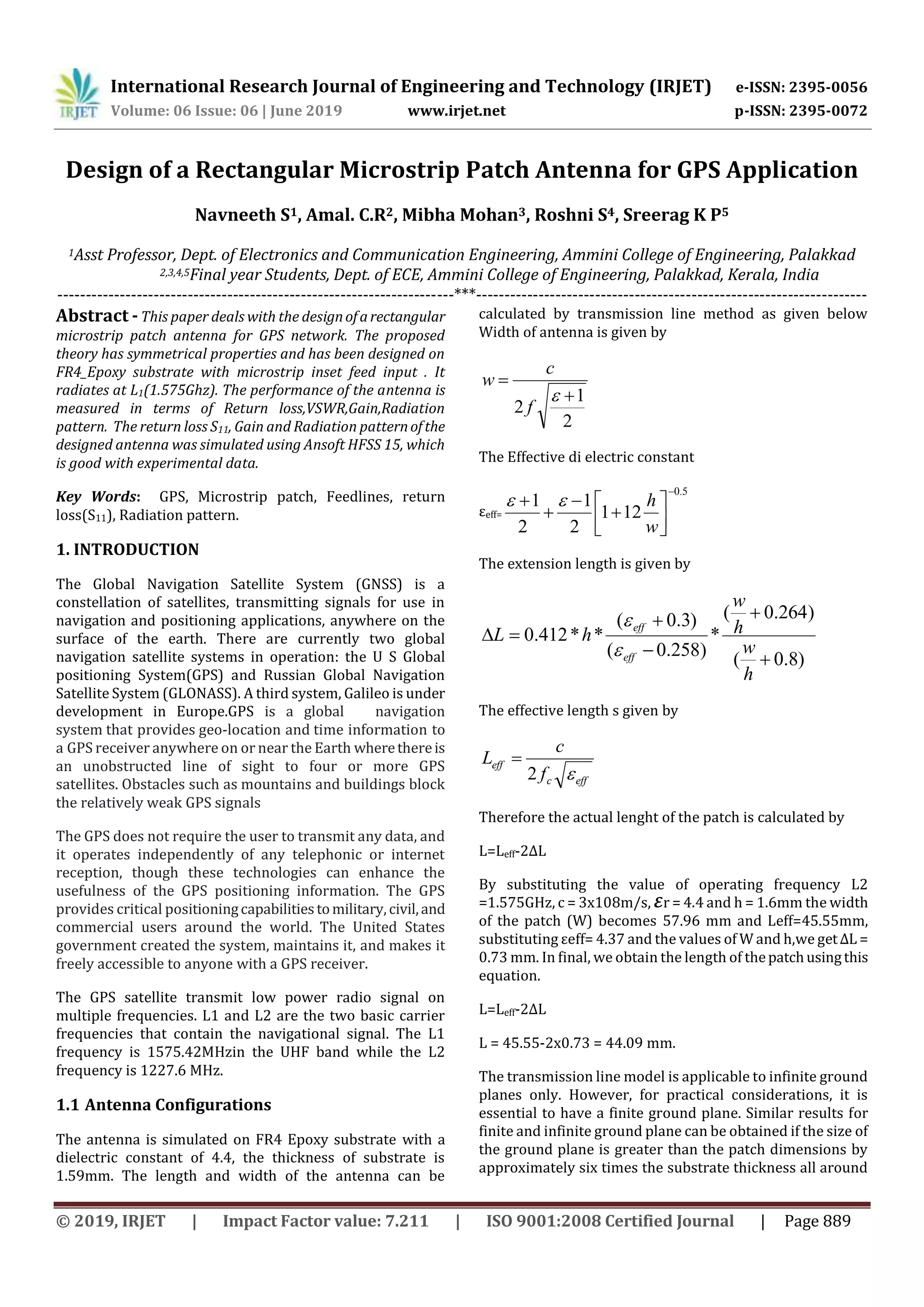 1) The document describes the design of a rectangular microstrip patch antenna for GPS applications.