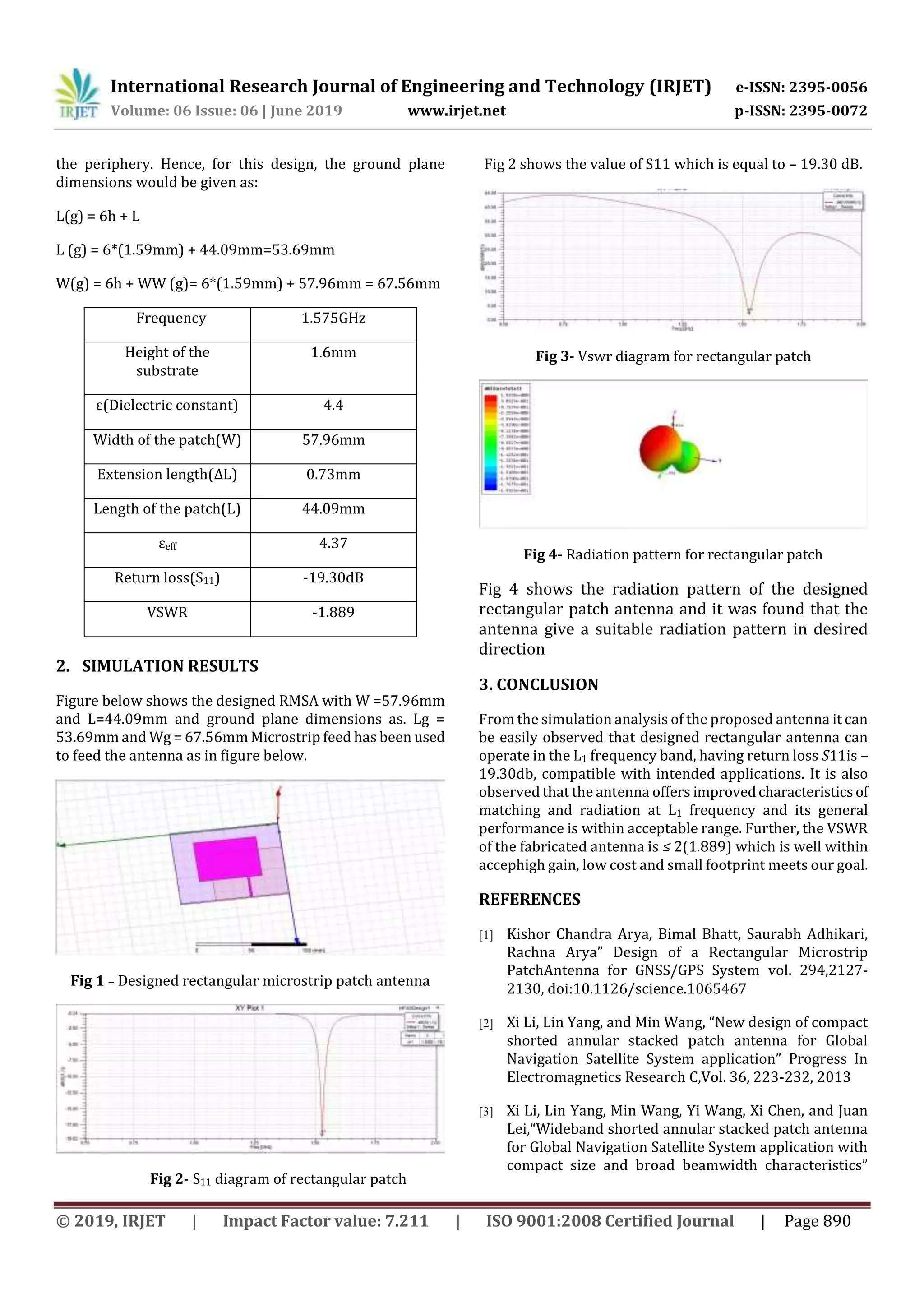2) The antenna was designed on an FR4 epoxy substrate with a dielectric constant of 4.4 and thickness of 1.59mm. It was designed to radiate at the L1 GPS frequency of 1.575GHz.