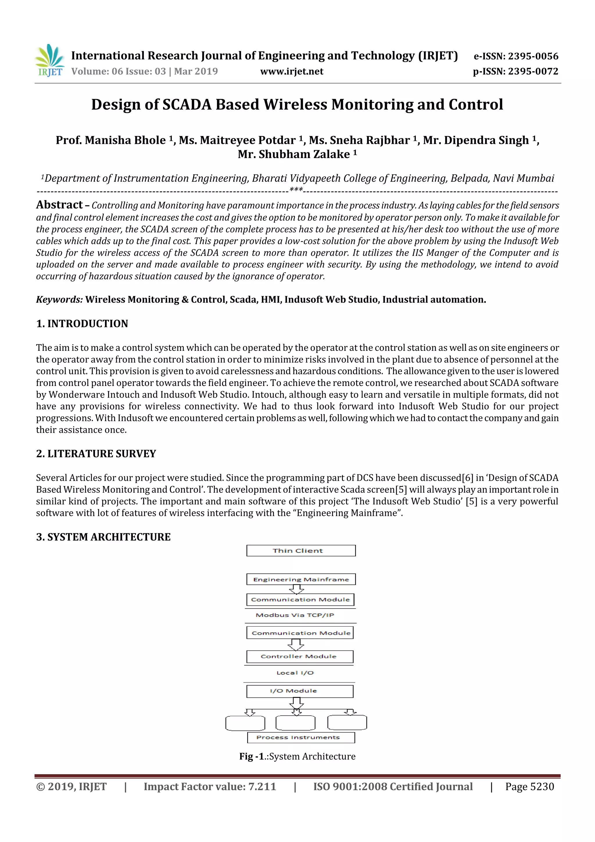 This document describes the design of a SCADA-based wireless monitoring and control system. It uses Indusoft Web Studio software to allow remote monitoring of an industrial process over wireless networks. Key aspects include: