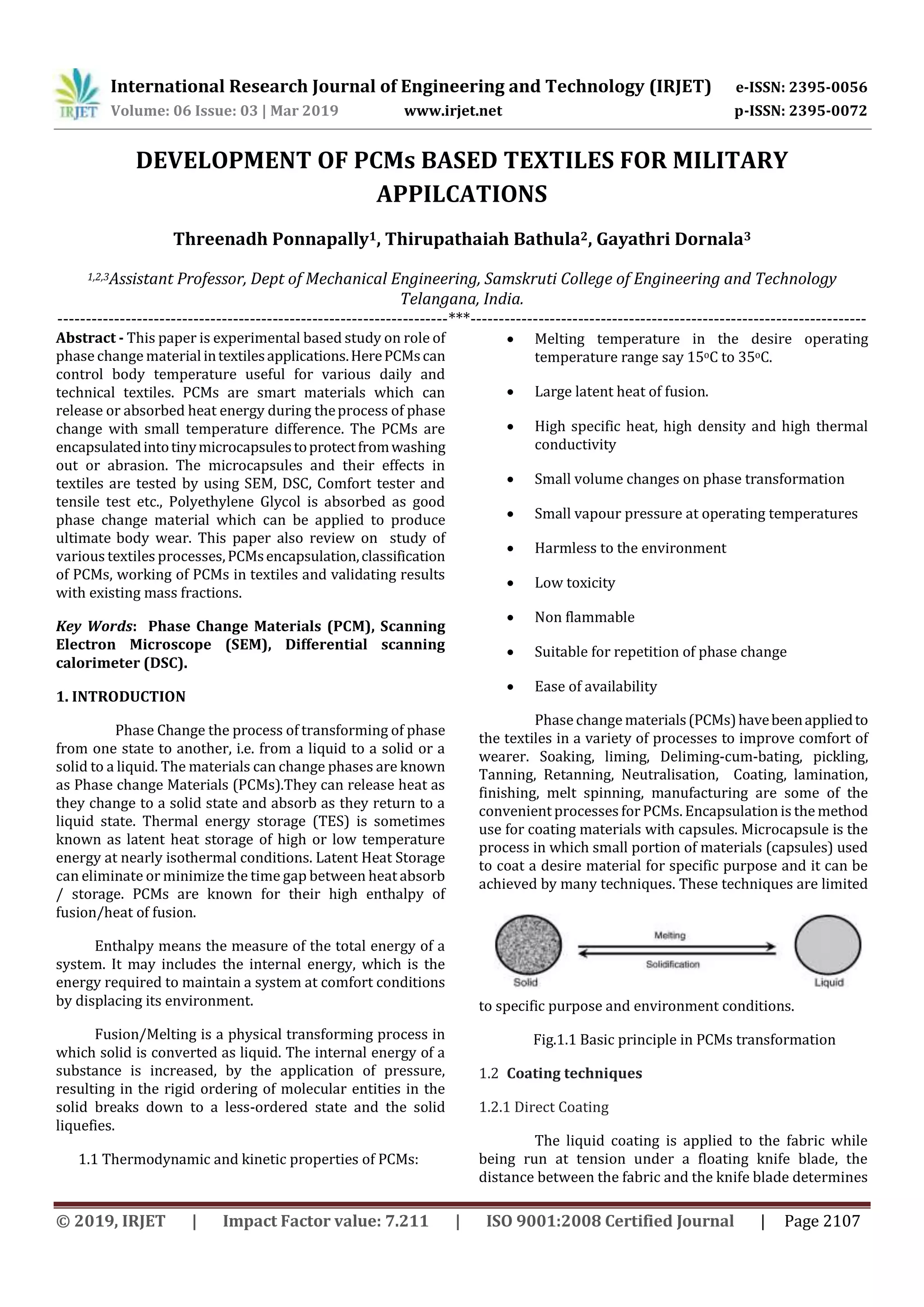 This document discusses developing phase change materials (PCMs) for military textile applications. PCMs can control body temperature by absorbing or releasing heat during phase changes. The document reviews PCM encapsulation techniques, classifications of PCMs, how PCMs work in textiles, and properties of potential PCMs like polyethylene glycol. PCMs in textiles could provide thermal comfort for military personnel by storing excess heat from the body during temperature rises and releasing it during temperature drops. The document evaluates PCMs like hydrated inorganic salts and polyethylene glycol for military textile applications based on their absorbing/releasing temperatures, latent heat, availability, and toxicity.