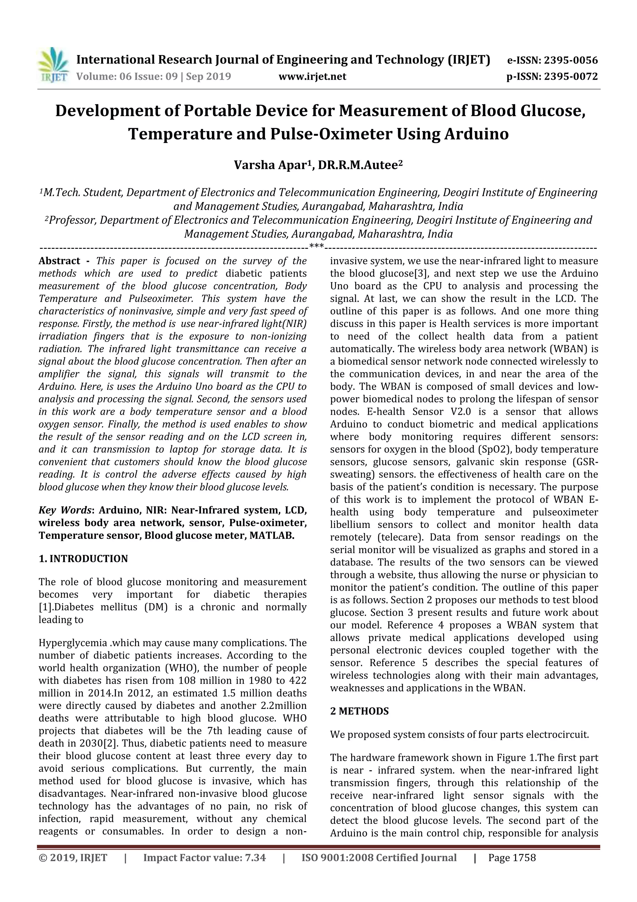 This document describes the development of a portable device that can measure blood glucose, temperature, and pulse oximeter readings using an Arduino. The device uses near-infrared light to non-invasively measure blood glucose levels. It also contains sensors to measure body temperature and blood oxygen levels. The Arduino processes the sensor signals and displays the measurement results on an LCD screen. The data can also be transmitted to a laptop for storage. The goal is to help diabetic patients conveniently monitor their health vitals.
