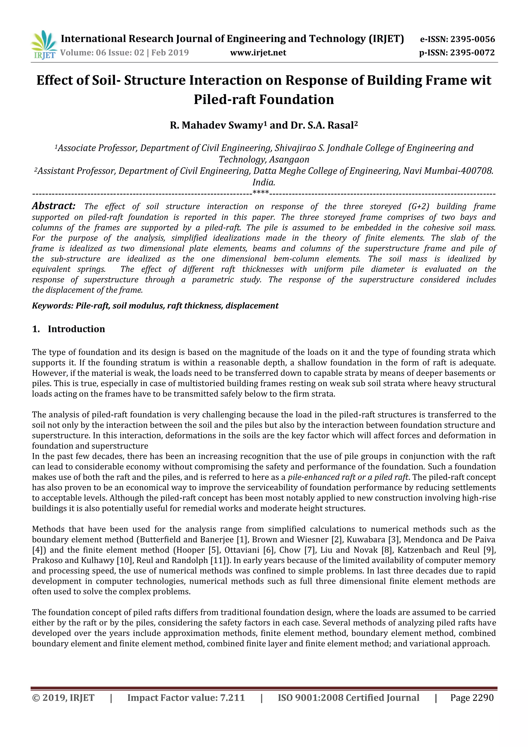 This document analyzes the effect of soil-structure interaction on the response of a three-story building frame supported by a piled-raft foundation. A finite element model is developed to model the frame, slab, beams, columns, piles, raft, and soil. Parametric studies are conducted to evaluate the effect of raft thickness and pile diameter on frame displacements. The key findings are that considering soil-structure interaction increases frame displacements compared to assuming a fixed base, and displacements decrease with increasing pile diameter and raft thickness due to improved soil resistance. Nonlinear soil behavior further reduces displacements compared to linear analysis.