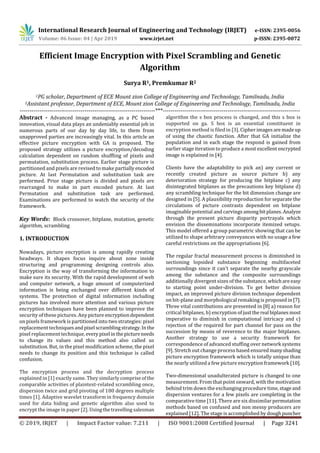 The document proposes an efficient image encryption method using pixel scrambling and genetic algorithms. The method involves segmenting the input image into blocks, randomly shuffling the pixels within each block, slicing the scrambled image into bitplanes, and applying genetic algorithm operations of crossover and mutation to further encrypt the data. Experiments on standard images show the method achieves a uniform histogram and low correlation between pixels, indicating high encryption strength. It also has faster encryption speeds compared to other algorithms. The document concludes the hybrid genetic algorithm approach provides an efficient and secure way to encrypt images.