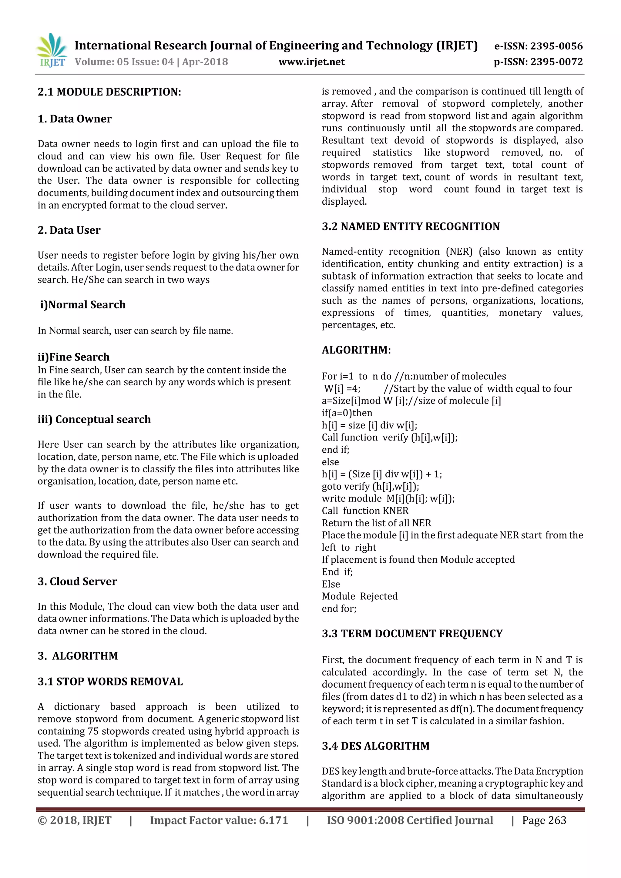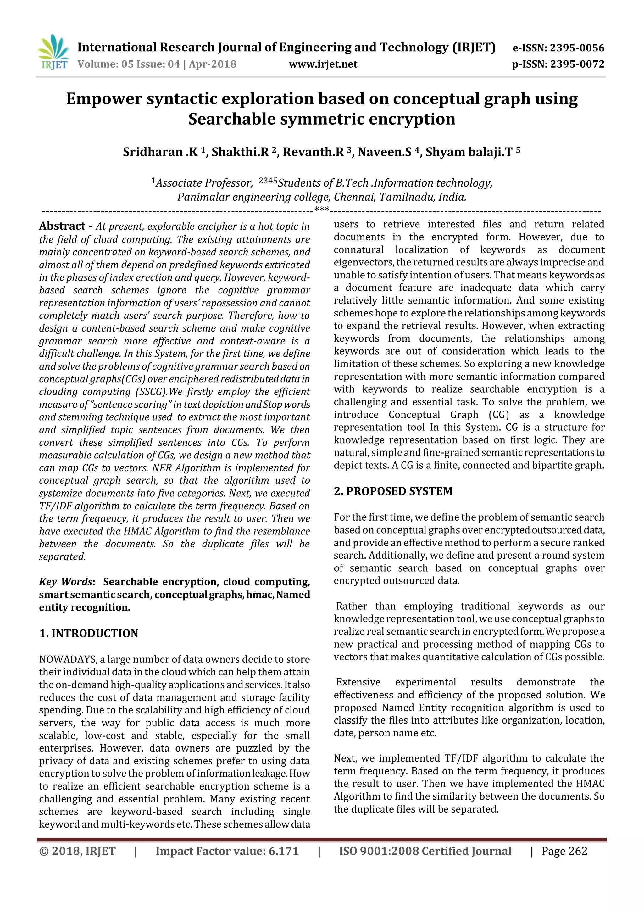 This document discusses a proposed system for empowering syntactic exploration based on conceptual graphs using searchable symmetric encryption. It begins with an abstract that outlines using conceptual graphs and related natural language processing techniques to perform semantic search over encrypted cloud data. It then describes the system modules, including data owners who can upload and authorize access to encrypted files, data users who can search for files, and a cloud server that stores the outsourced encrypted data and indexes. Key algorithms discussed include named entity recognition, term frequency-inverse document frequency (TF-IDF) calculation, data encryption standard (DES) encryption, and hashed message authentication codes (HMACs) to identify duplicate documents. The proposed system architecture involves data owners encrypting and outsourcing documents