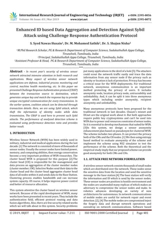 This document summarizes a research paper that proposes a Challenge-Response Authentication Protocol (CRAP) to detect Sybil attacks in wireless sensor networks. The CRAP generates unique keys for each transmission to provide encrypted communication. It is used to prevent Sybil attacks where an attacker steals node identities during data transmission. The performance of the detection scheme is evaluated using detection ratio. The proposed CRAP involves three phases: 1) nodes are selected and grouped, 2) two nearby nodes transmit packets to detect collisions indicating Sybil nodes, 3) if no hop is detected between Sybil identities, the nodes are confirmed to be under attack. The scheme is analyzed using performance metrics like packet delivery ratio, energy efficiency, and attack detection ratio.
