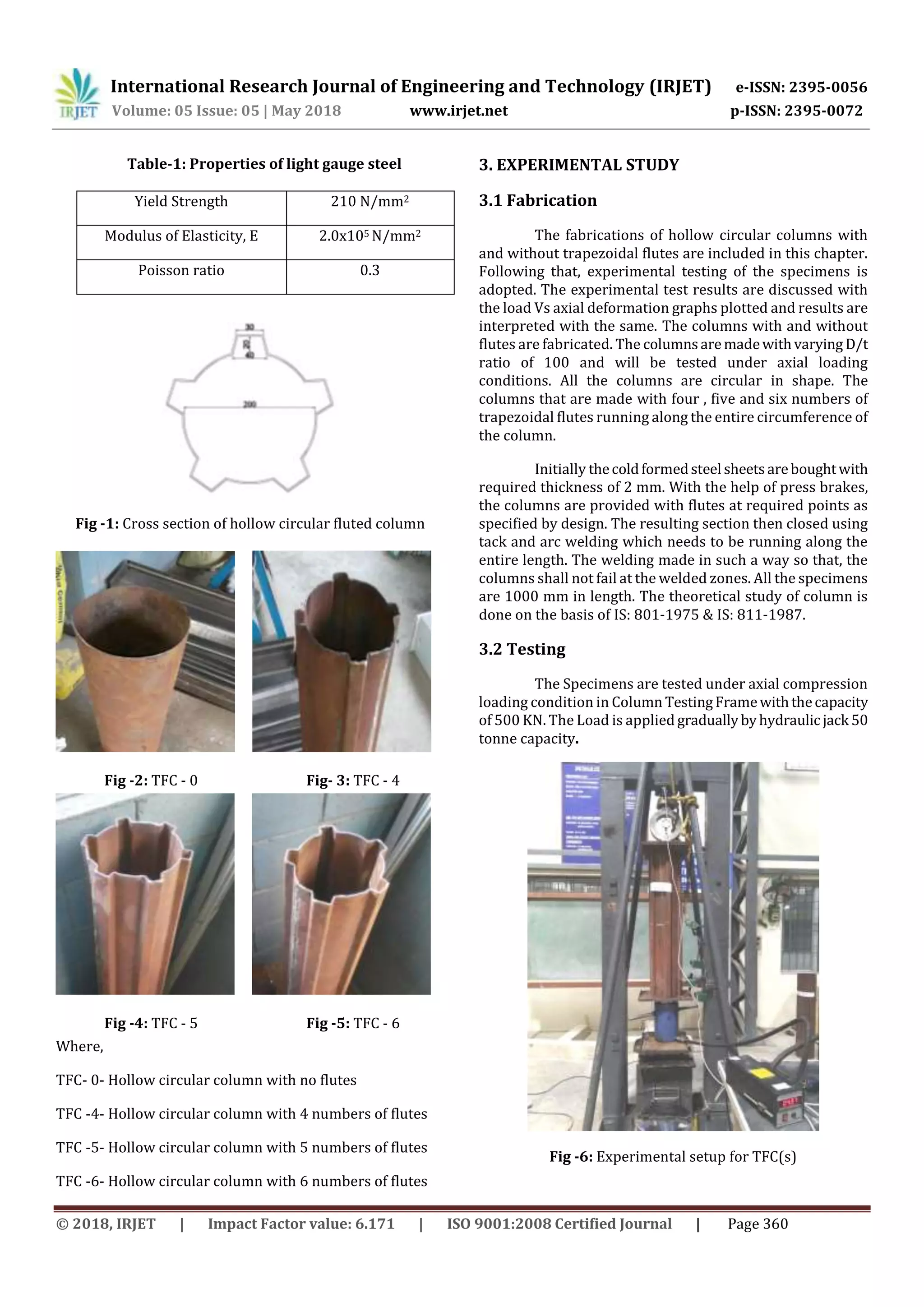 2) Trapezoidal flutes were added to hollow circular steel columns to increase their moment of inertia. Columns with 4, 5, and 6 flutes were tested under axial loading.