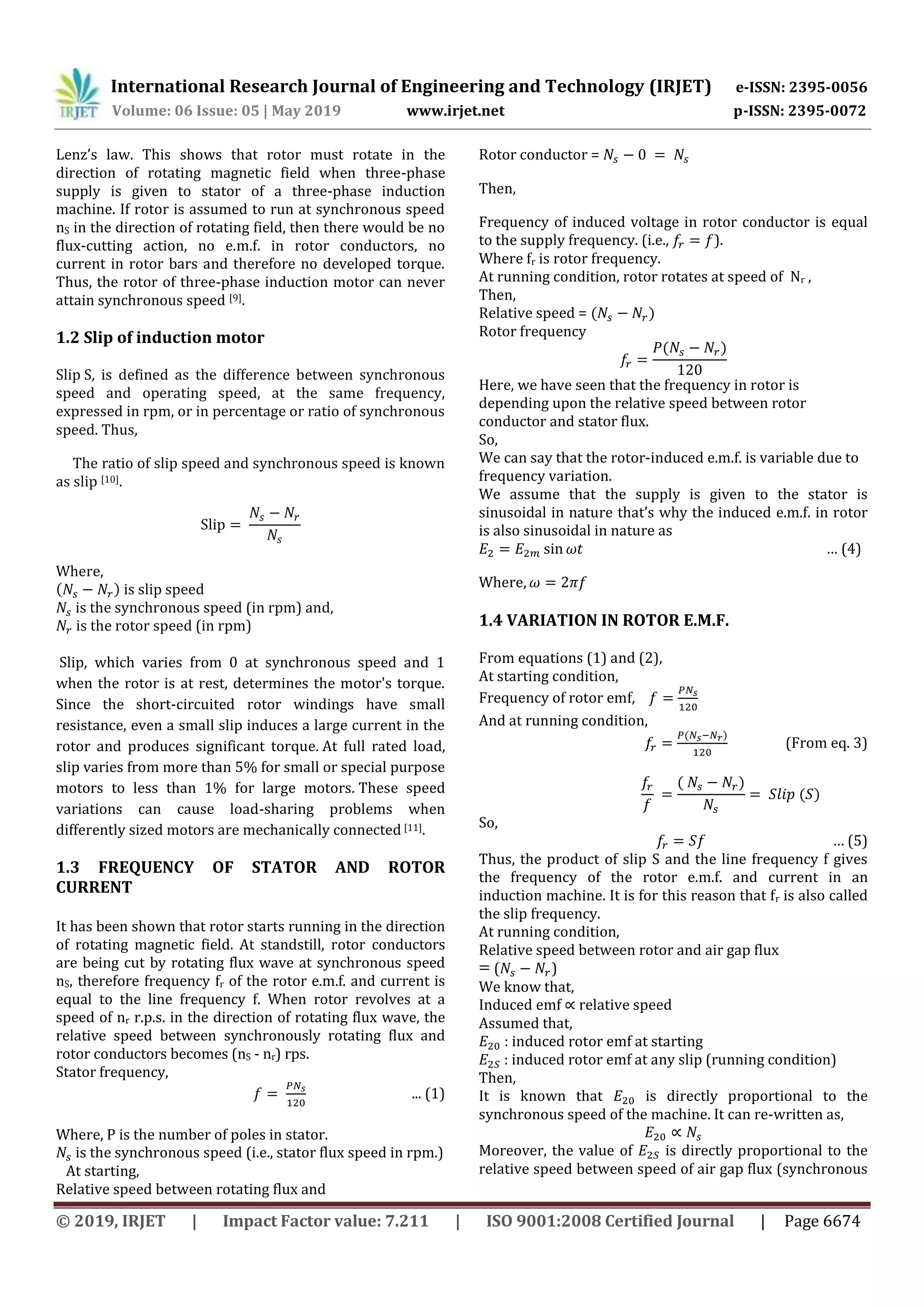2. Key results include that the frequency of the rotor current depends on the relative speed between the rotor and rotating stator magnetic field. The rotor current frequency decreases from the line frequency at standstill to a lower "slip frequency" as the load and rotor speed increase.
