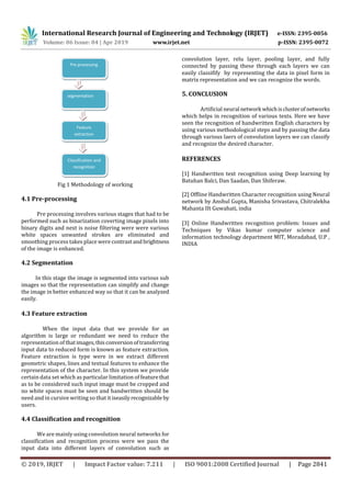 This document discusses a study on recognizing handwritten English characters using artificial neural networks. The researchers used a convolutional neural network (CNN) model that was trained on segmented handwritten character images. The CNN model classified the characters through multiple layers, including convolution, ReLU, pooling, and fully connected layers. This allowed the model to accurately recognize individual handwritten English characters. The researchers segmented the input images, extracted features, then classified and recognized the characters with the CNN model to identify handwritten words. The study aims to reduce manual work by automating the recognition of handwritten texts using deep learning techniques.