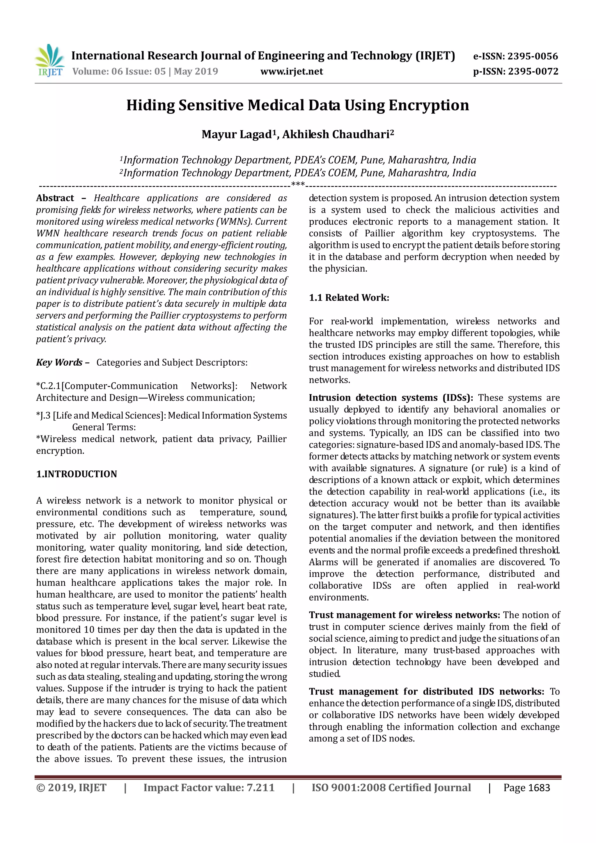 This document summarizes a research paper about securely hiding sensitive medical data using encryption. The paper proposes a system that distributes a patient's data across multiple encrypted data servers. It uses Paillier cryptosystems to allow statistical analysis of the encrypted patient data without compromising privacy. The system includes wireless medical sensors that monitor patients and transmit encrypted data to a database. It uses an access control system and statistical analysis protocols that employ Paillier encryption to allow authorized users like doctors to access and analyze the encrypted patient data without revealing its contents. The goal is to protect sensitive medical information from privacy breaches while still enabling useful analysis of aggregated patient data.