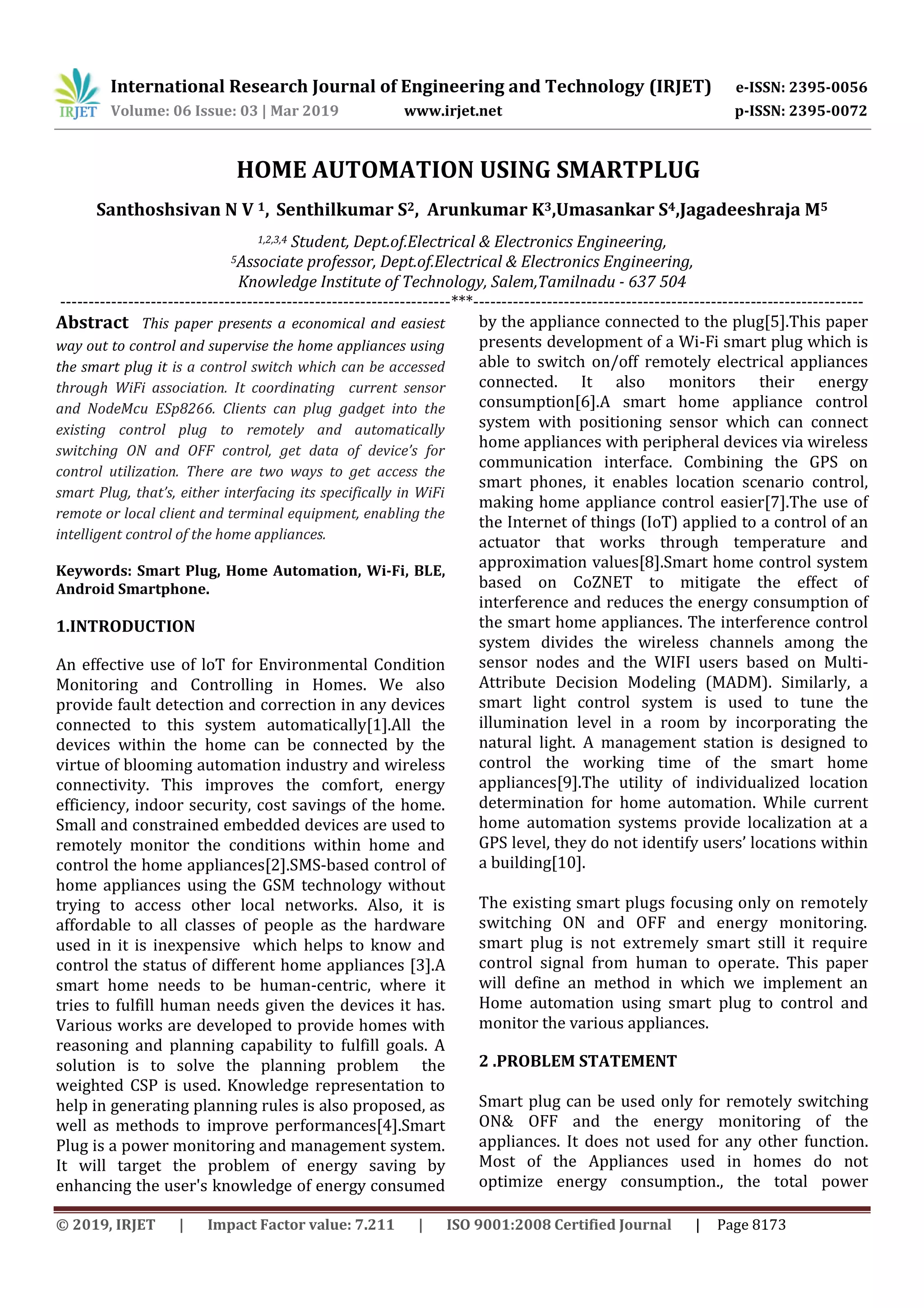 This document discusses a smart plug system for home automation using WiFi. The smart plug allows appliances to be remotely controlled and monitored for energy consumption. It uses an ESP32 microcontroller connected to a current sensor to measure appliance energy usage. When a user's smartphone comes within Bluetooth range, the smart plug can automatically turn appliances on or off. The system was tested successfully by controlling a light remotely and monitoring its current draw. The smart plug provides a low-cost way to automate home appliances without disturbing existing controls.