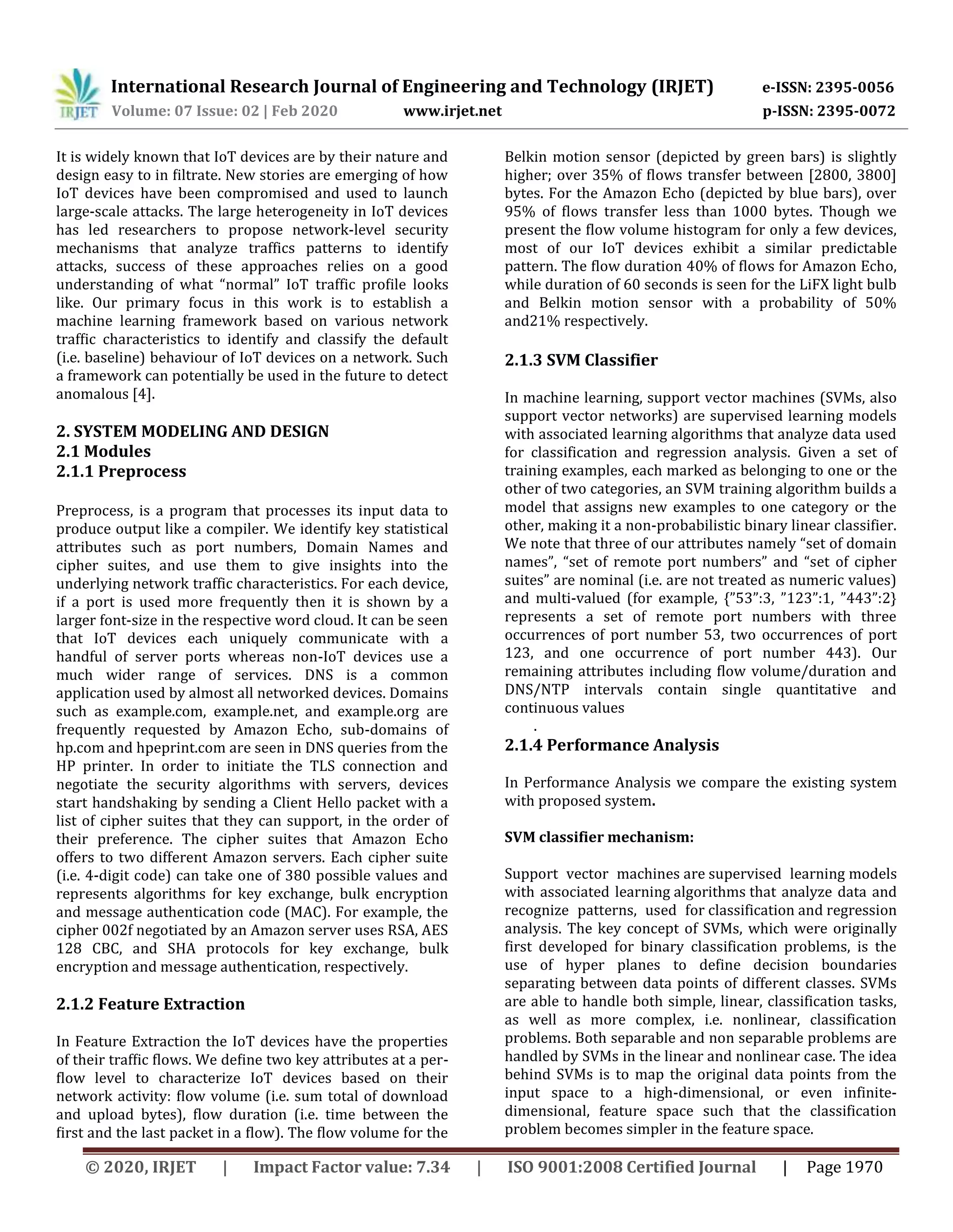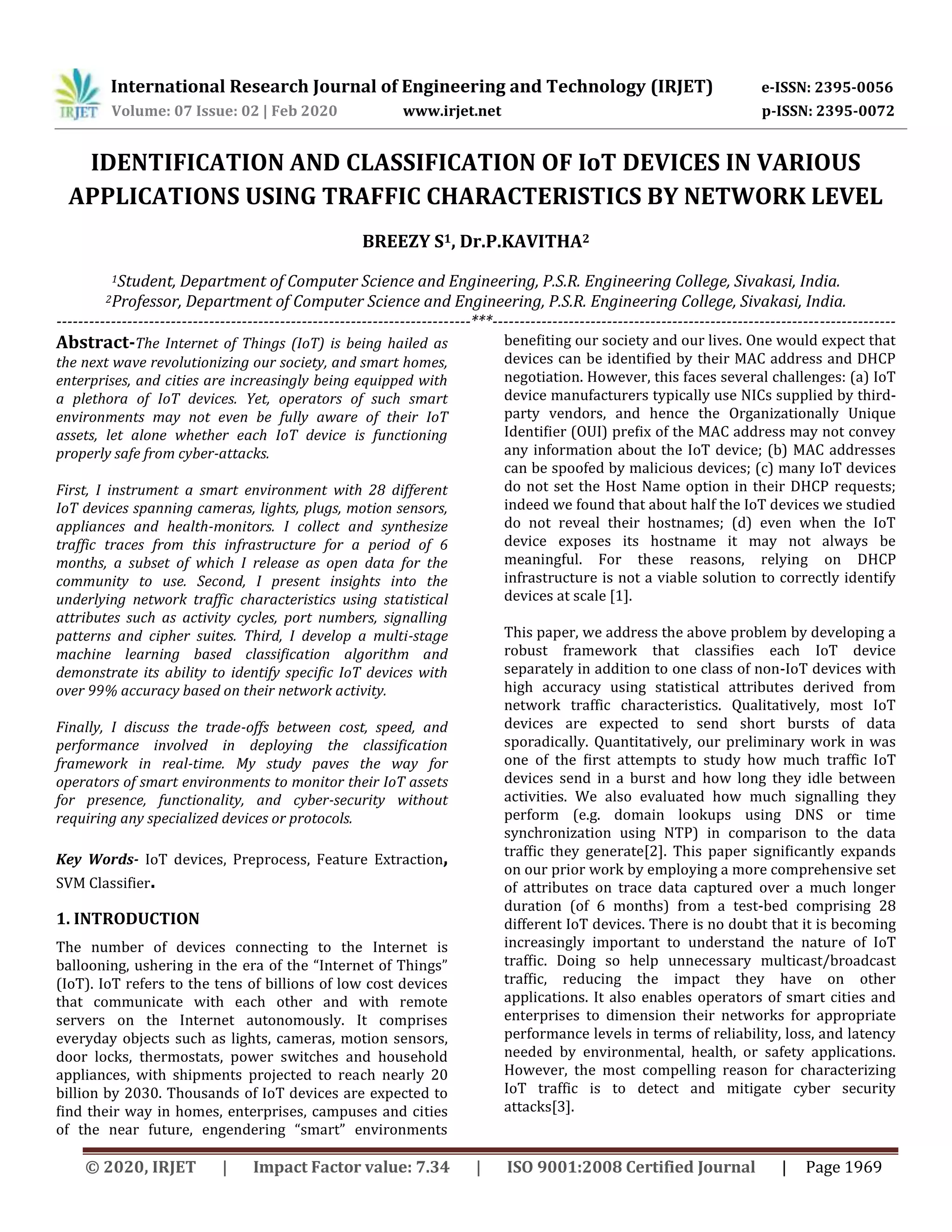 This document presents a study on identifying and classifying Internet of Things (IoT) devices based on their network traffic characteristics using machine learning algorithms. The study involved collecting network traffic data from 28 different IoT devices over a period of 6 months. Statistical attributes like port numbers, domain names, and cipher suites were extracted from the traffic to analyze characteristics. A support vector machine (SVM) classifier was developed and shown to identify specific IoT devices with over 99% accuracy based on their network activity attributes. The study aims to help network operators monitor and manage IoT devices on their networks.