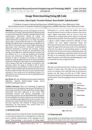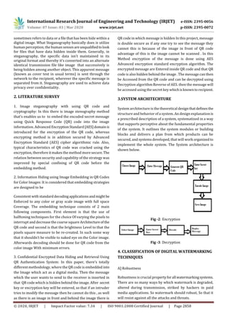This document presents a technique for digital image watermarking using QR codes. It aims to provide copyright protection and authentication of digital images. The technique works by encrypting an image using AES encryption and embedding the encrypted data in a QR code. The QR code is then hidden behind a cover image using steganography. This makes it difficult for unauthorized users to detect the hidden watermark or tamper with the encrypted image data. The document discusses related work on image watermarking and steganography techniques. It also provides details of the proposed system architecture, classification of digital watermarking techniques, the AES encryption algorithm used, and potential applications of the presented image watermarking approach.