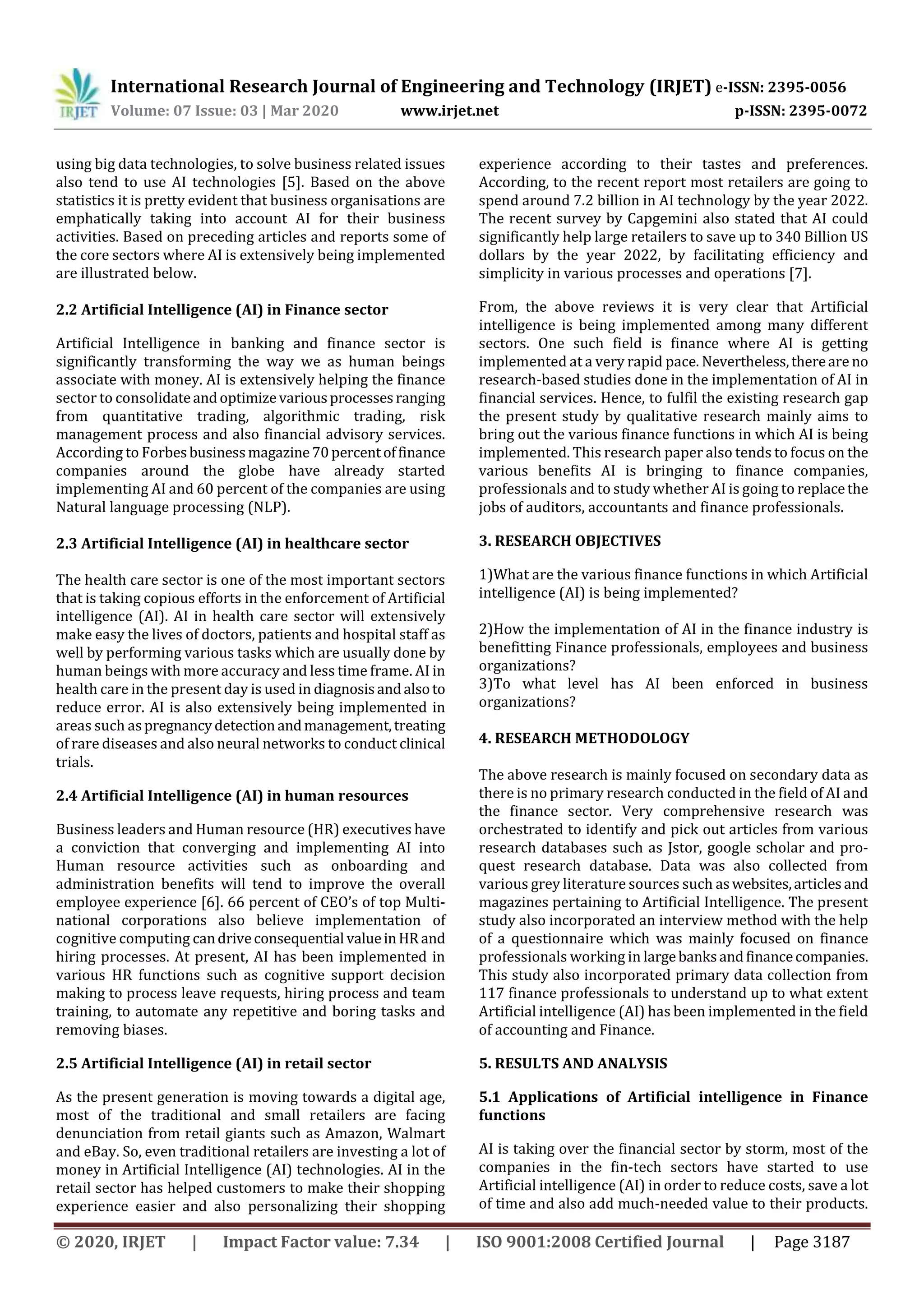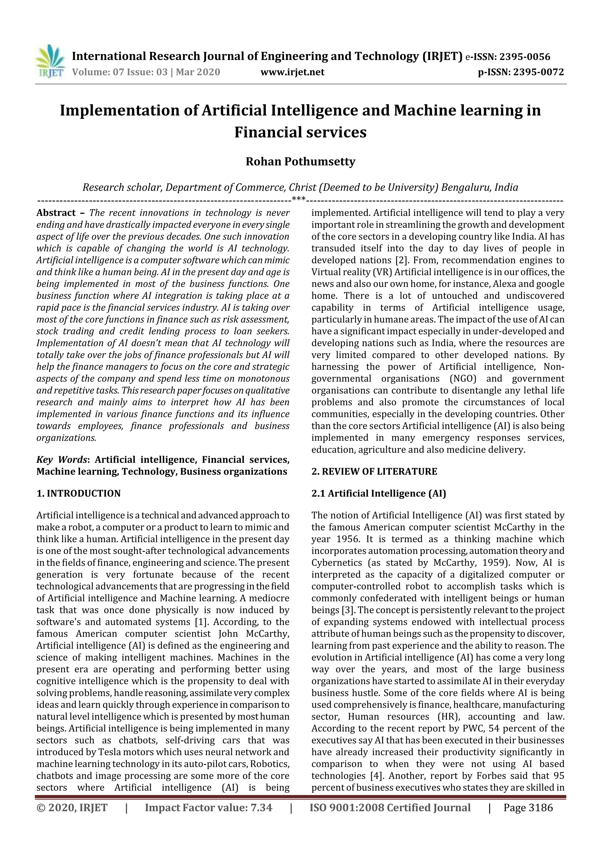 This document discusses the implementation of artificial intelligence and machine learning in the financial services industry. It begins by defining artificial intelligence and discussing how AI is being used in various business functions like finance, healthcare, and human resources. It then focuses on how AI is being implemented in various finance functions like lending services, stock trading, and fraud detection to improve processes, reduce costs and risks, and provide more personalized services. The document presents research on the benefits of AI for finance professionals, businesses, and customers through faster, more accurate decision-making and greater access to credit. It aims to understand how AI is changing jobs in the finance industry.