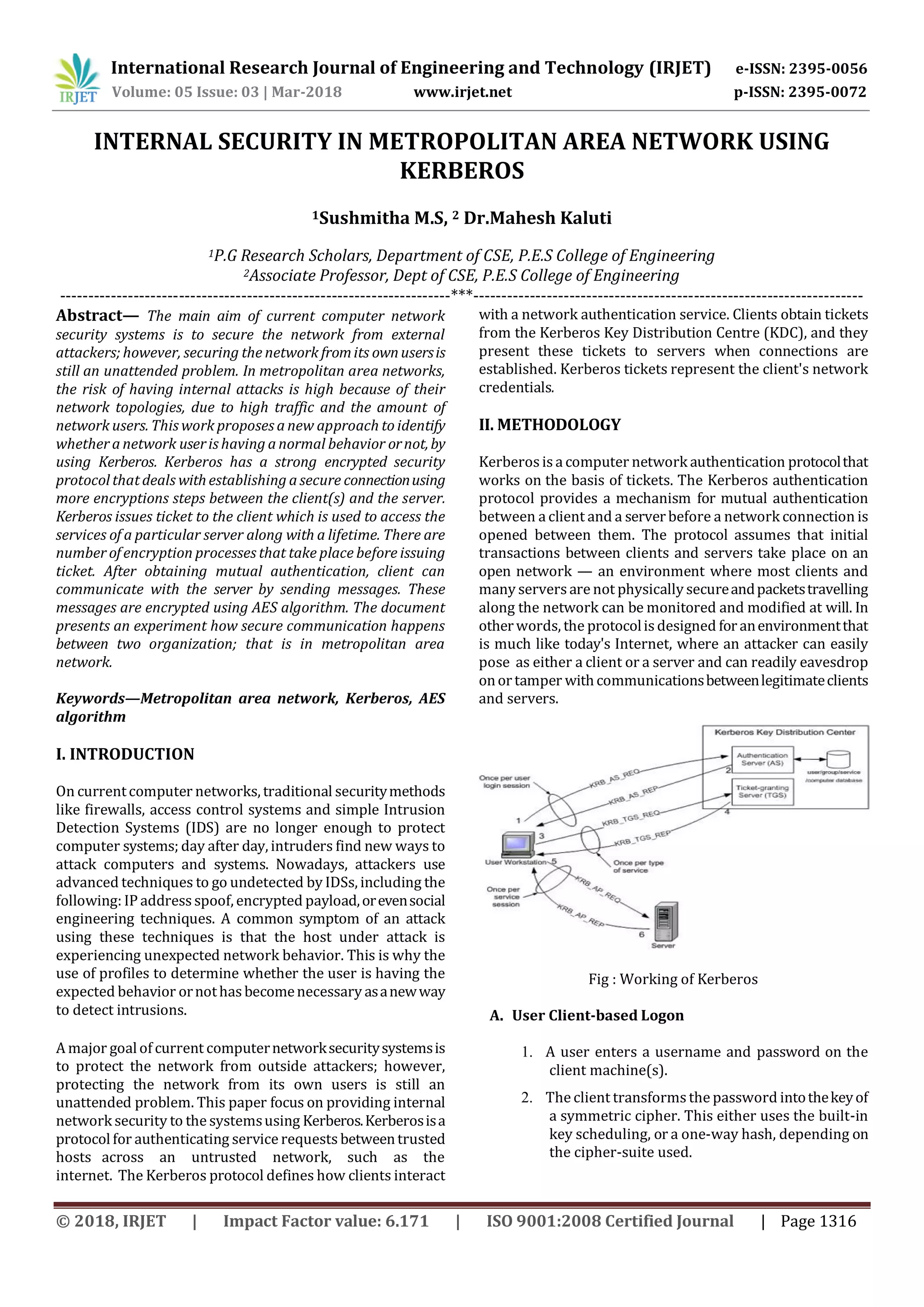 This document describes using Kerberos to improve internal security in metropolitan area networks. Kerberos is an authentication protocol that establishes secure connections between clients and servers. It issues tickets to authenticated clients that can then be used to access server services. Communication between clients and servers involves multiple encryption steps using AES. The document presents an experiment on how Kerberos enables secure communication between organizations in a metropolitan area network by mutually authenticating users and authorizing services.