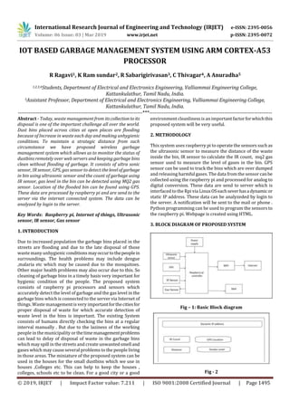 This document describes an Internet of Things (IoT) based garbage management system that uses sensors and a Raspberry Pi microcontroller to monitor garbage bins remotely. The system uses an ultrasonic sensor to measure garbage levels, an IR sensor to count garbage items, an MQ2 gas sensor to detect gas levels, and a GPS sensor to locate bins. The sensor data is processed by the Raspberry Pi and sent to a server via an internet connection. The data on the server can be analyzed to identify bins that need emptying due to high garbage or gas levels. This smart garbage monitoring system aims to improve waste management and public health.