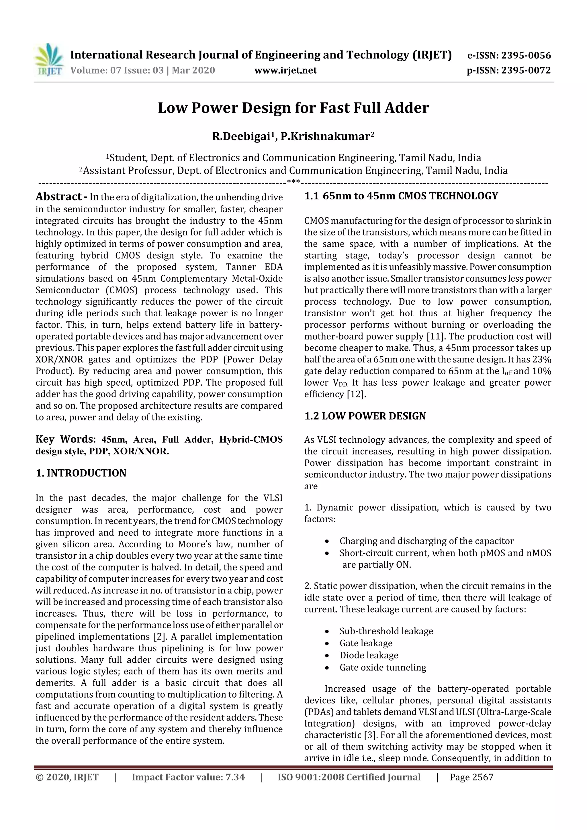 This document describes the design of a low power, high speed full adder circuit using 45nm CMOS technology. It discusses how reducing the size of transistors from 65nm to 45nm allows for lower power consumption and higher processing speeds. A new hybrid full adder circuit is proposed that uses simultaneous XOR/XNOR gates and transmission gates to minimize delay and reduce dynamic and static power dissipation. Simulation results show the proposed 20T, 17T, 26T and 22T full adder circuits have higher speeds and lower power consumption than previous designs.
