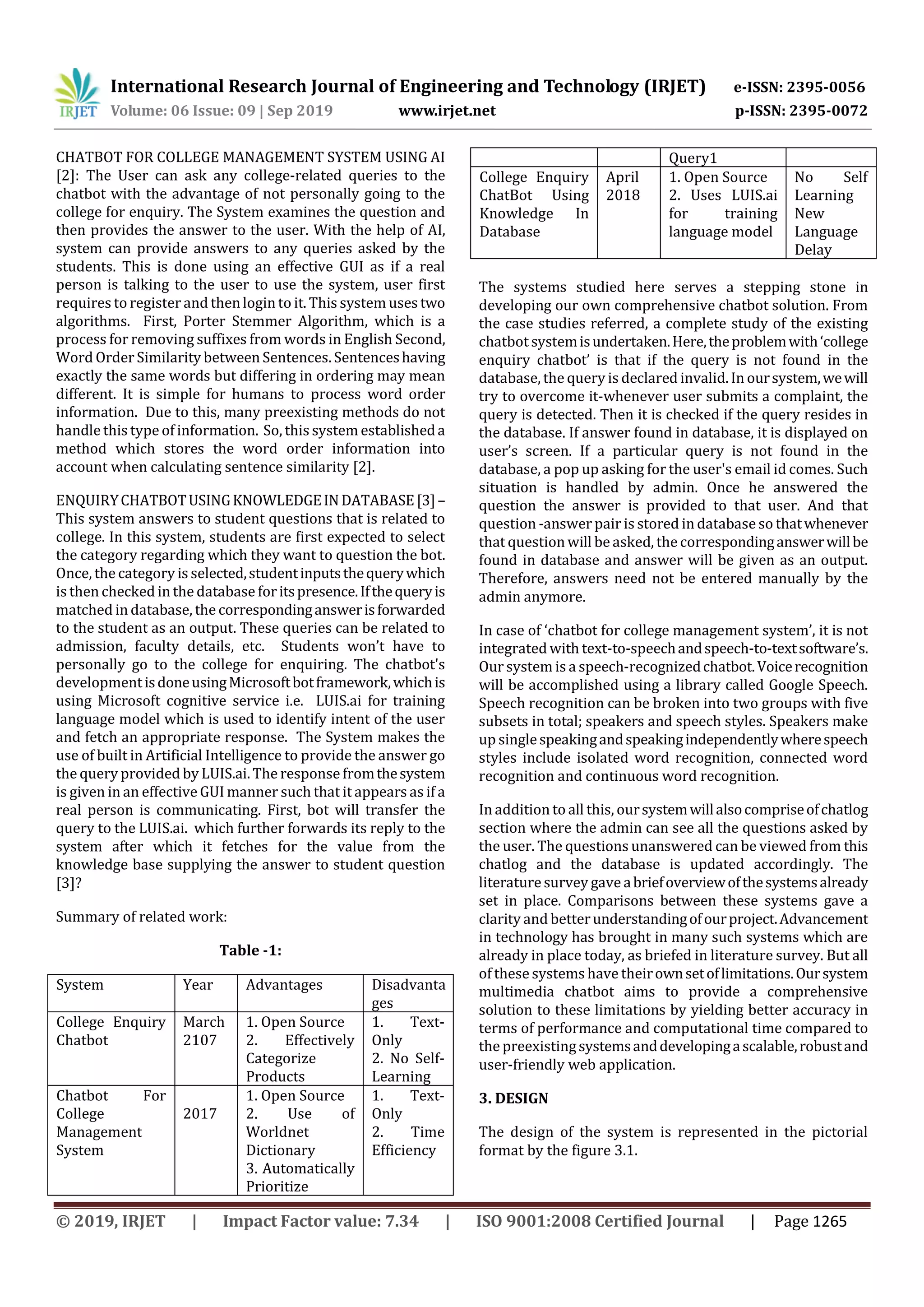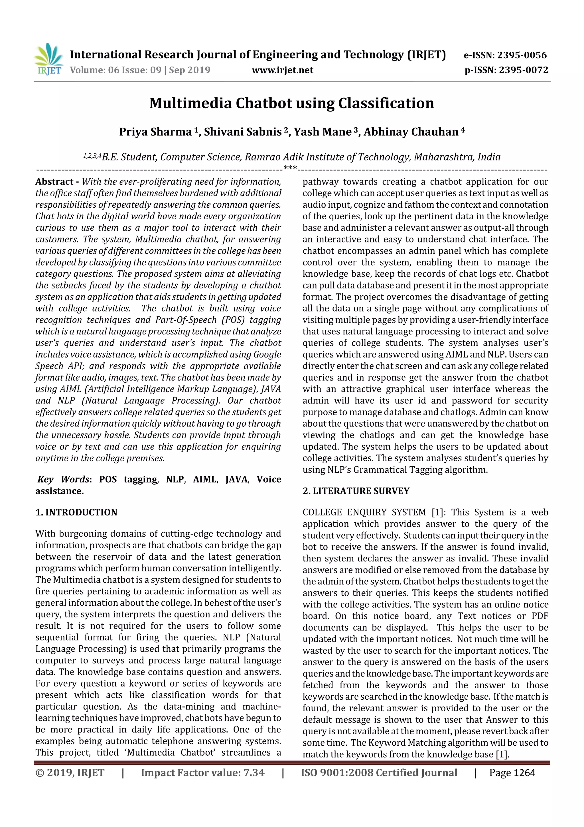 The document describes a multimedia chatbot developed for students at Ramrao Adik Institute of Technology to answer queries about various college committees and activities using classification, natural language processing including part-of-speech tagging, and voice recognition capabilities. The chatbot was created using AIML, Java, and speech APIs to analyze user input and respond with text, audio, or images as appropriate from its knowledge base. An admin panel allows college staff to manage the knowledge base and review unanswered questions to improve the accuracy of the chatbot over time.
