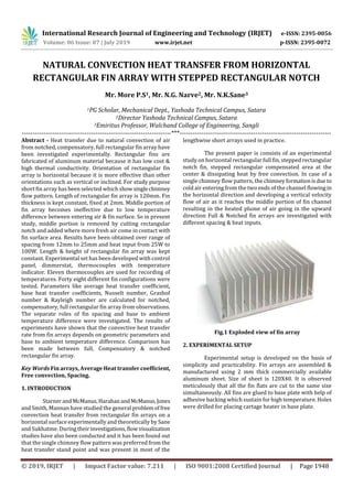 This document summarizes an experimental study on heat transfer from horizontal rectangular fin arrays with stepped notches. Rectangular fins made of aluminum were tested with different spacing and heat inputs. Forty-eight configurations of full, notched, and compensated fin arrays were tested. The results show that a notched fin array dissipates more heat through convection and radiation compared to a full fin array, especially at larger spacings. However, at smaller spacings a notched fin array performs worse due to restricted air flow. In general, notched fin arrays had higher average heat transfer coefficients but lower base heat transfer coefficients compared to full fin arrays.