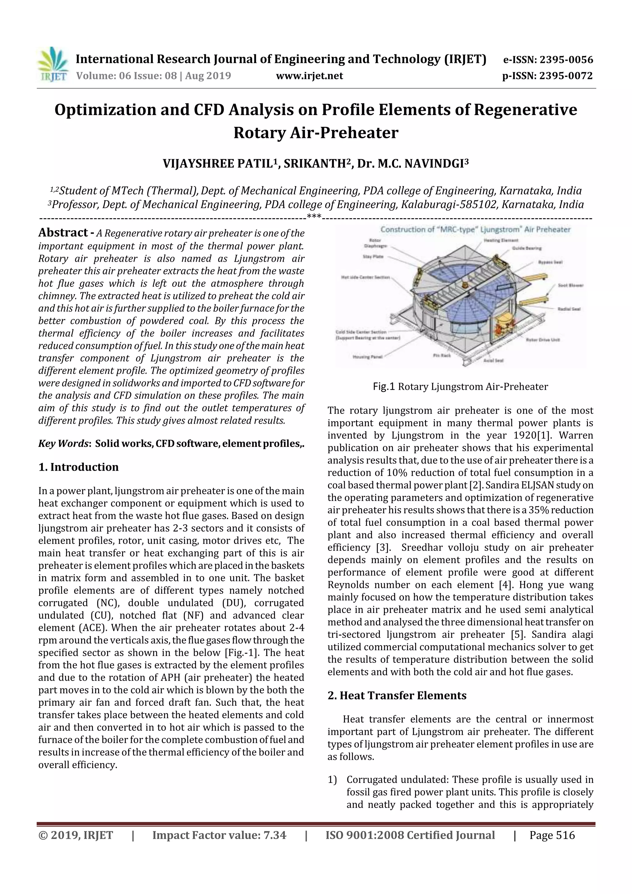 This document discusses the optimization and computational fluid dynamics (CFD) analysis of different profile elements in a regenerative rotary air preheater. It begins with an introduction to rotary air preheaters and describes the various profile types used as heat transfer elements. Experimental measurements from a coal-fired power plant are presented. CFD models of five profile elements are analyzed to determine their outlet air and flue gas temperatures. The results show that the advanced clear element profile provides the best performance with higher air outlet temperature and lower flue gas outlet temperature compared to other profiles.
