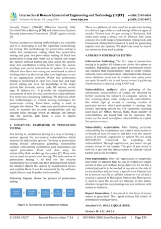 This document discusses penetration testing using the Metasploit framework. It begins with an introduction to penetration testing and why it is important for ensuring system and network security. It then describes the phases of penetration testing: information gathering, vulnerability analysis, vulnerability exploitation, post exploitation, and report generation. Finally, it discusses using tools in the Metasploit framework like exploits and payloads to conduct penetration testing according to these phases and ethical approaches. The goal is to identify vulnerabilities before attackers can exploit them.