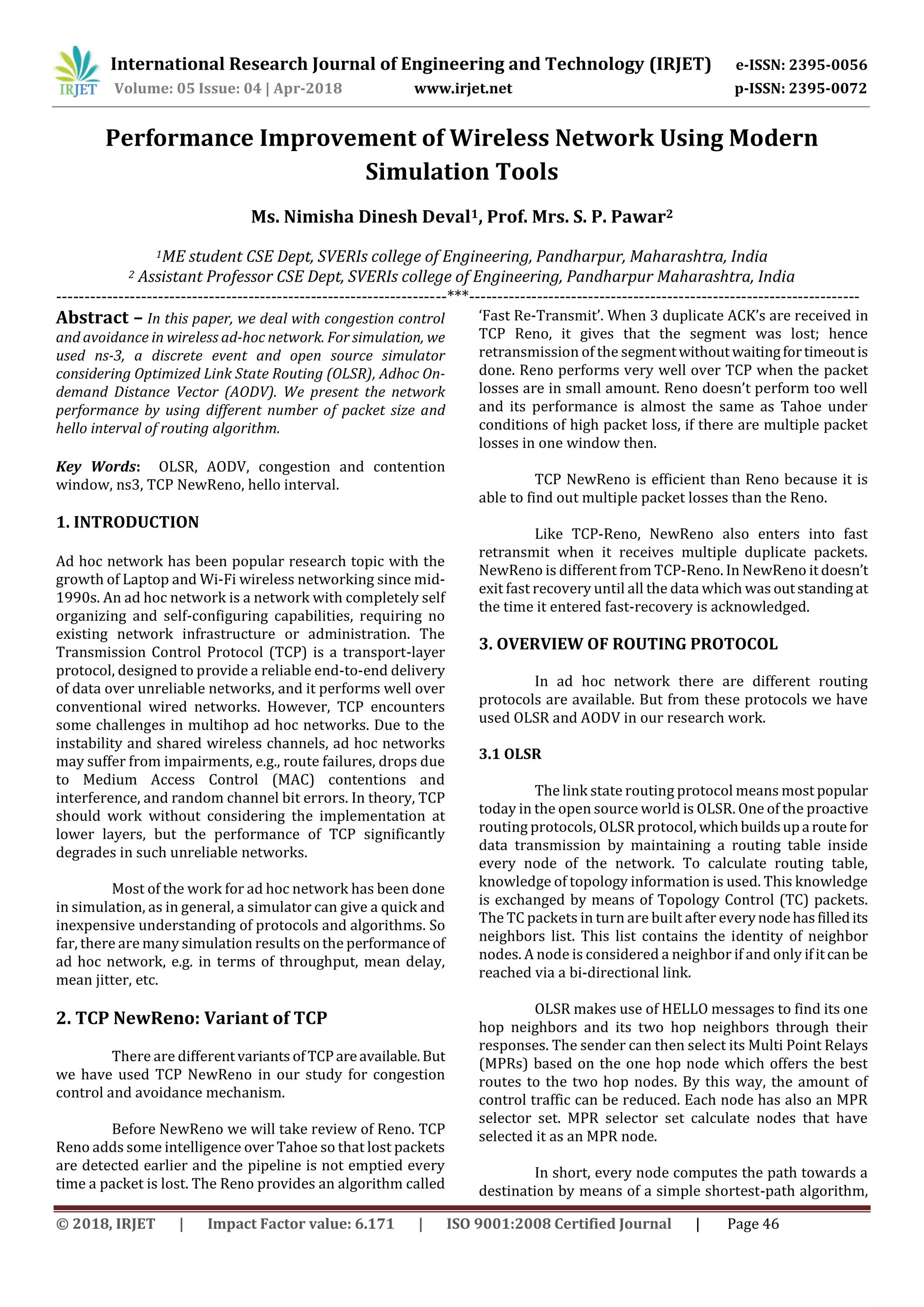 This document summarizes a research study that used the ns-3 network simulator to analyze the performance of two routing protocols - Optimized Link State Routing (OLSR) and Adhoc On-demand Distance Vector (AODV) - in a wireless ad hoc network under different conditions. The study varied parameters like packet size, number of nodes, and hello interval (the frequency at which routing information is broadcast) and measured metrics like throughput, delay, jitter, packet delivery ratio, packet loss, and congestion window. The results showed how the performance of the two protocols was impacted by changes to these parameters. The goal was to better understand congestion control and avoidance in wireless ad hoc networks through simulation.