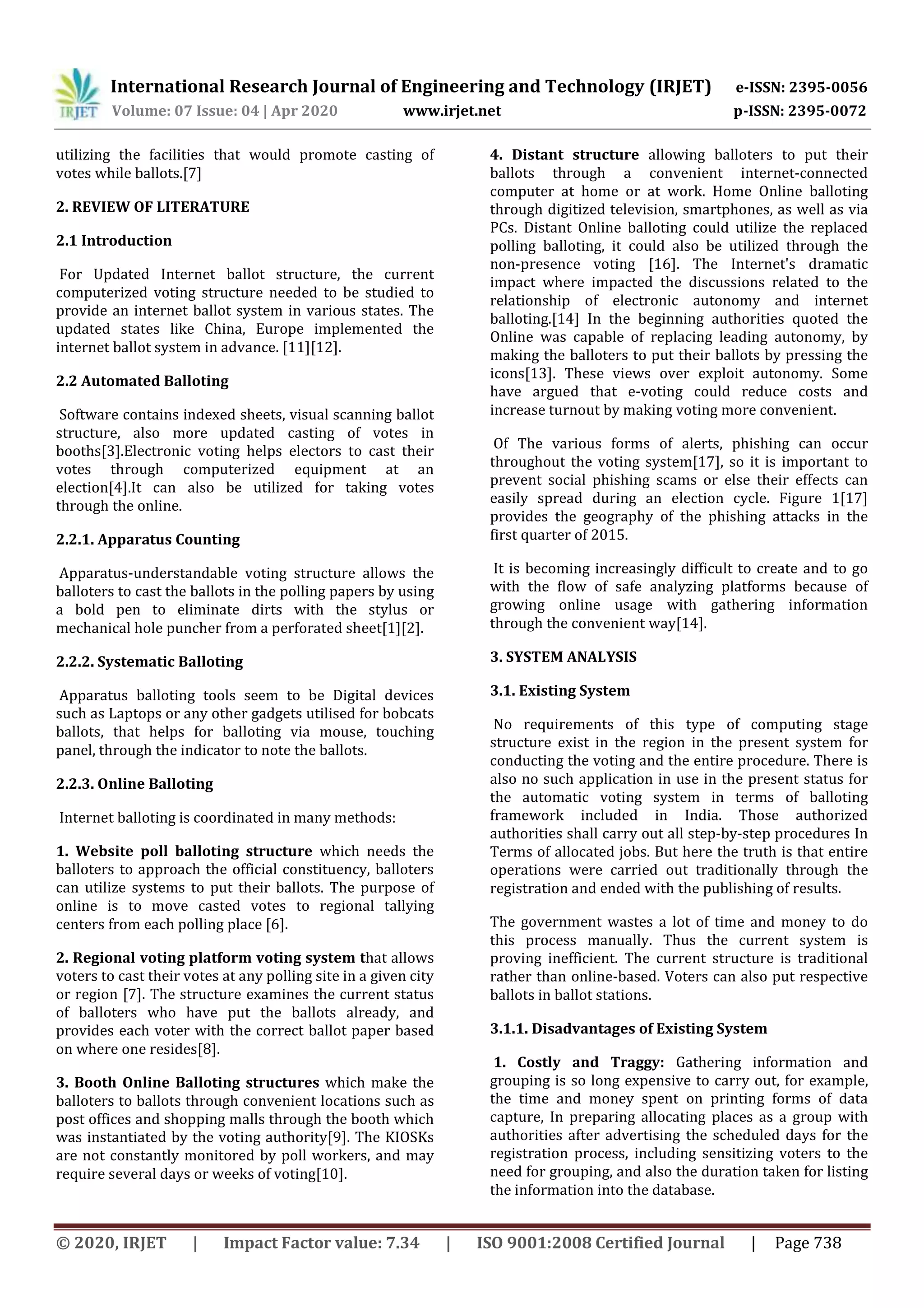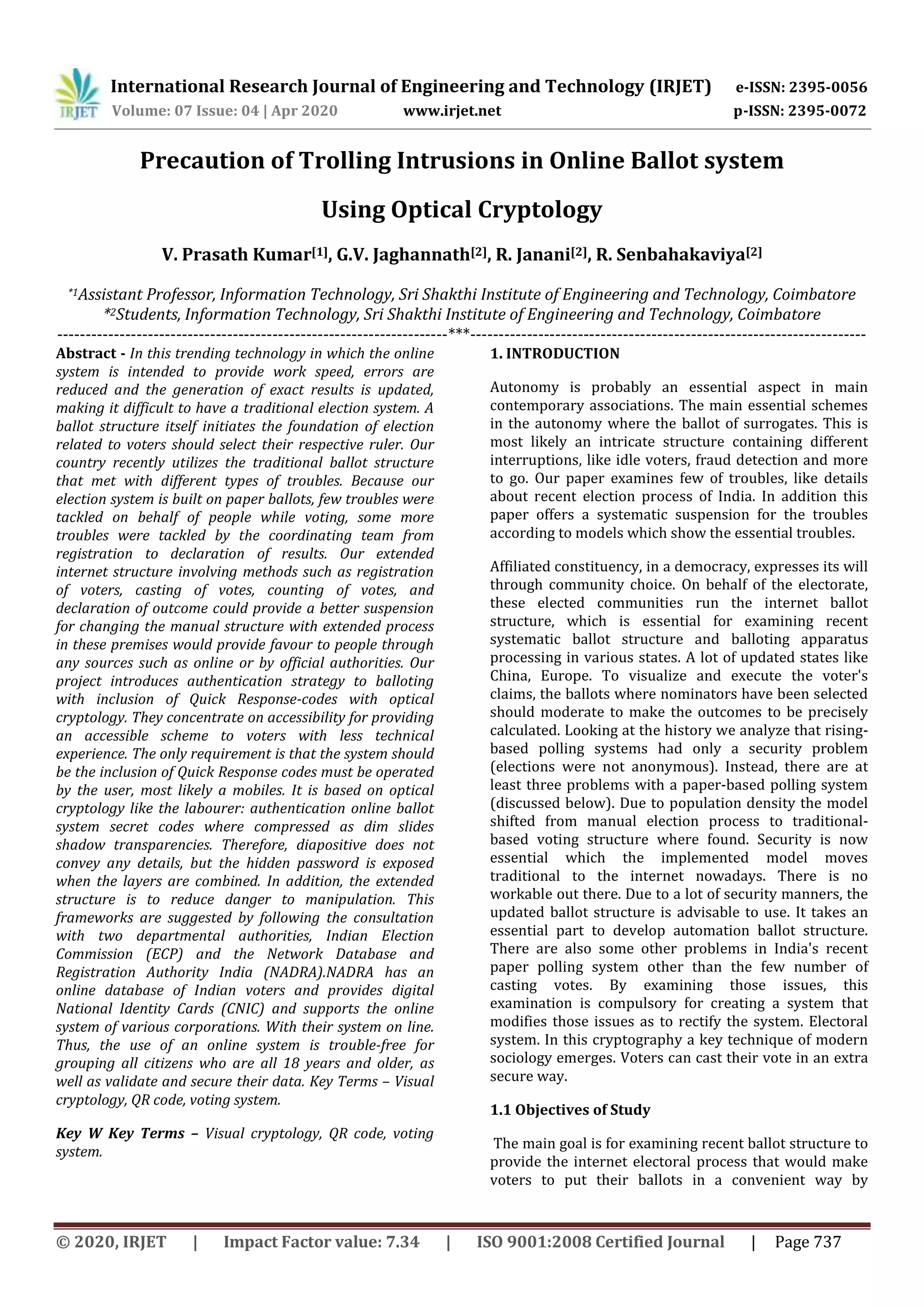 This document proposes a new online voting system for India that uses optical cryptology and QR codes to securely authenticate voters and prevent election tampering. The existing paper-based system has problems like voter fraud and errors in counting votes. The proposed system would allow voters to cast their ballots online conveniently using their mobile phones by scanning QR codes linked to their credentials. This could help modernize India's elections and reduce issues like those seen in recent paper-based elections. The system aims to be accessible for voters while also increasing security through the use of optical cryptology techniques to encrypt voter authentication codes.