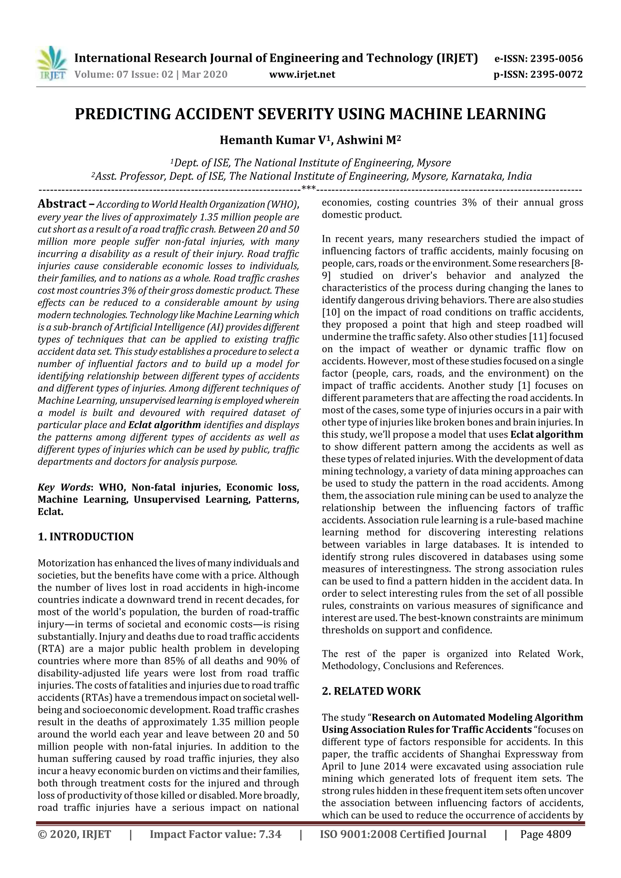 This document discusses predicting accident severity using machine learning. It begins with background on the large human and economic toll of road accidents worldwide. It then discusses using machine learning techniques like association rule mining to discover patterns between accident types and injury types in a dataset. Specifically, it uses an unsupervised learning approach with the Eclat algorithm to build a model and identify these patterns from accident records of a particular area. This can help traffic authorities and medical professionals better analyze accidents and injuries.