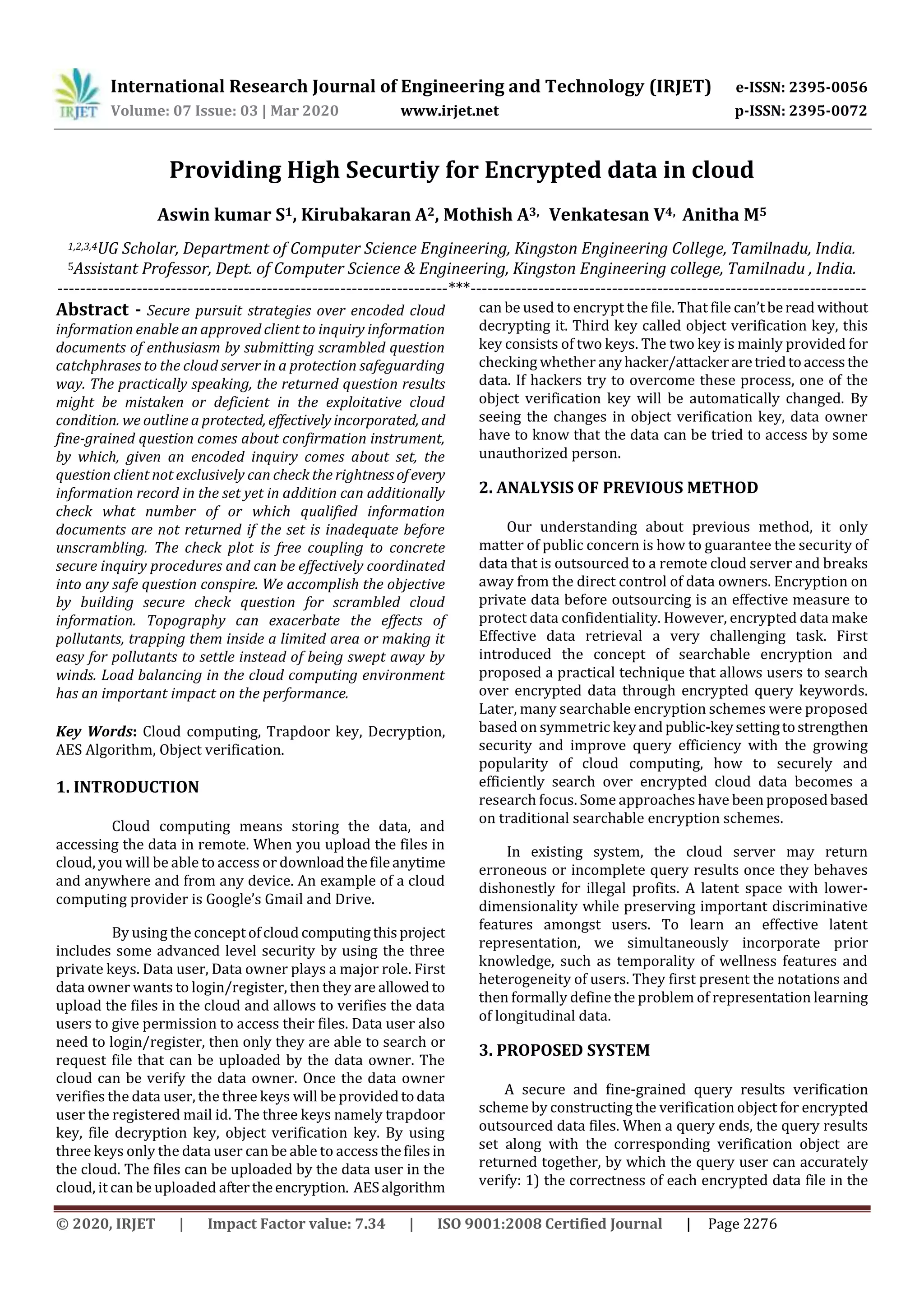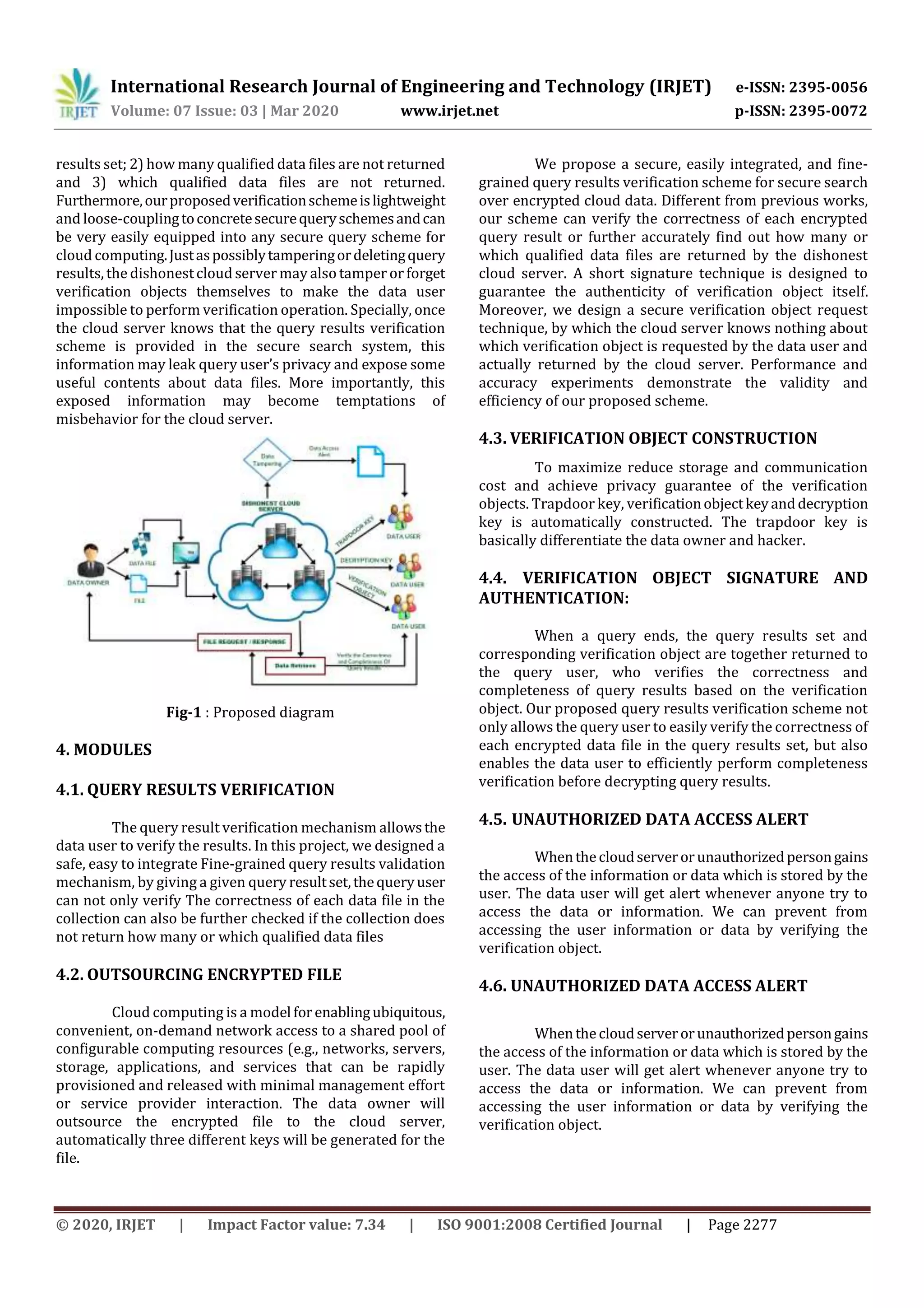 This document proposes a scheme for providing high security for encrypted data stored in the cloud. It outlines a secure, easily integrated, and fine-grained mechanism for verifying query results over encrypted cloud data. The scheme allows an authorized user to verify the correctness of each file in a query result set, as well as detect if any qualified files were not returned. It constructs verification objects for outsourced encrypted files that can be used to verify results. Trapdoor, decryption, and verification keys are generated to control access and detect unauthorized access attempts. The scheme guarantees the authenticity of verification objects and ensures the cloud server learns nothing about requested objects.