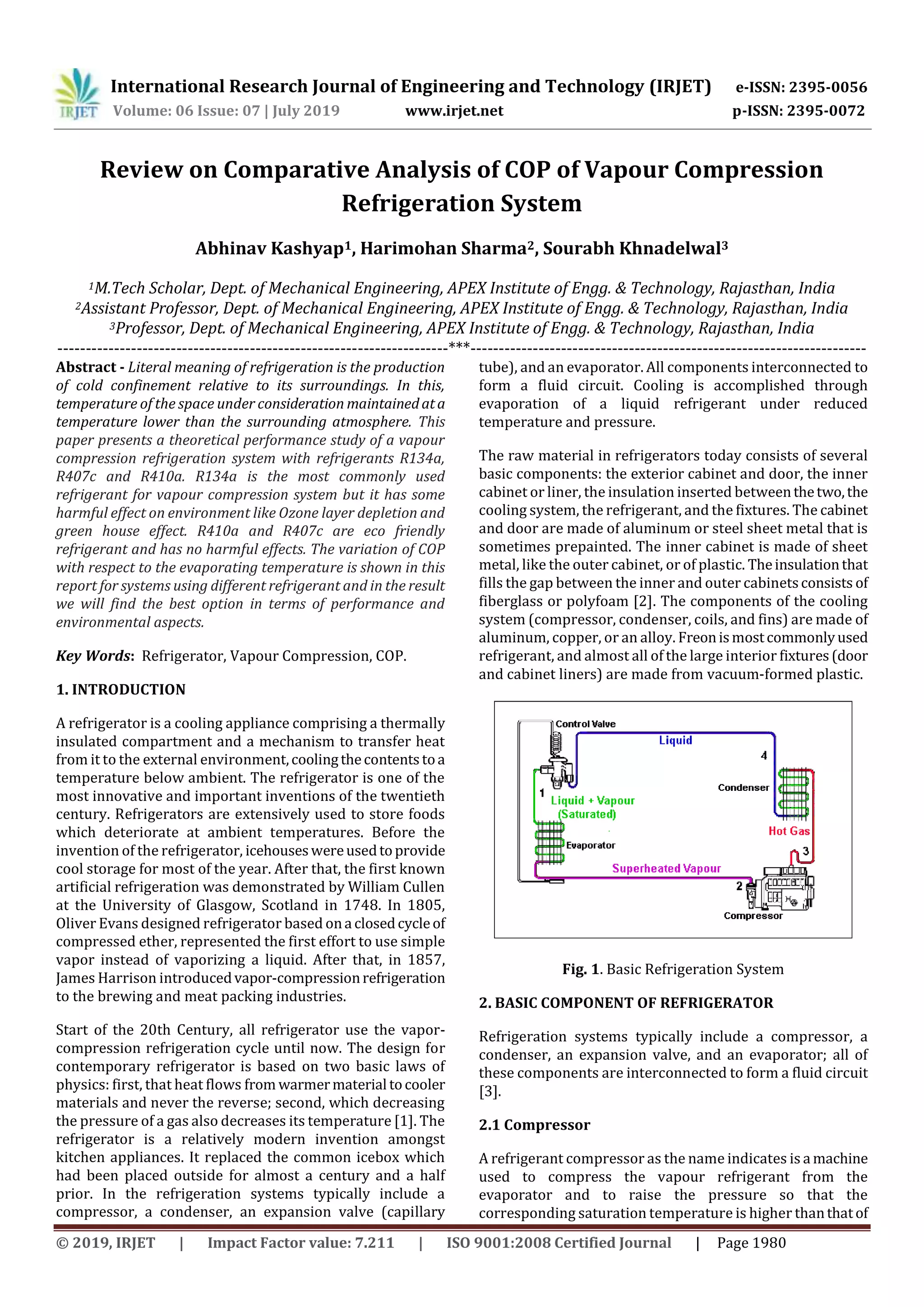 This document reviews the comparative analysis of the coefficient of performance (COP) of vapor compression refrigeration systems using different refrigerants. It analyzes the COP of systems using R134a, R407c, and R410a refrigerants. R134a is commonly used but harms the environment, while R407c and R410a are eco-friendly alternatives. The COP varies with evaporating temperature for each refrigerant. The document aims to determine the best refrigerant option based on performance and environmental impact. It provides background on vapor compression refrigeration systems and their basic components, including the compressor, condenser, expansion valve, and evaporator.