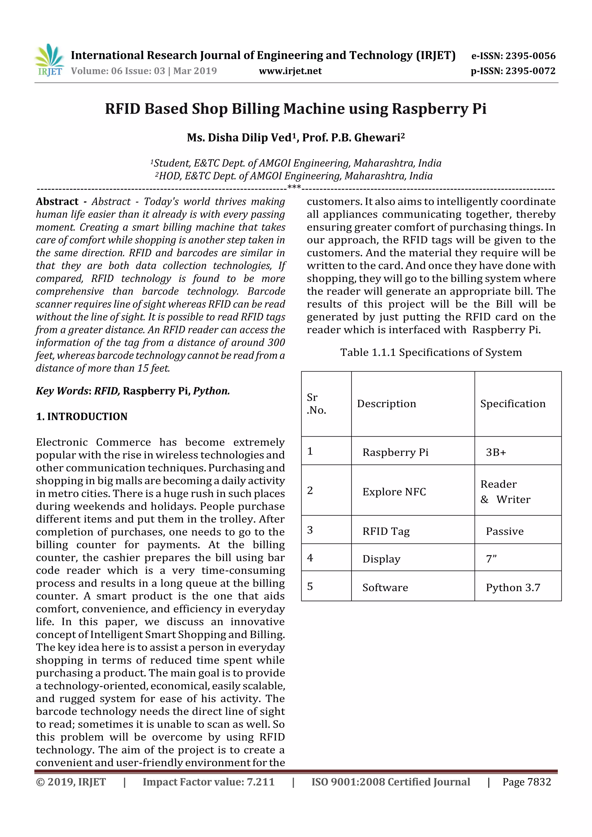 The document proposes a smart shopping and billing system using RFID technology with a Raspberry Pi. Customers would be given an RFID card to store the items they select, and their total bill would be generated automatically when they place the card near the RFID reader connected to the Raspberry Pi. This system aims to make the shopping and billing process more efficient and convenient by eliminating long queues typically seen at billing counters.