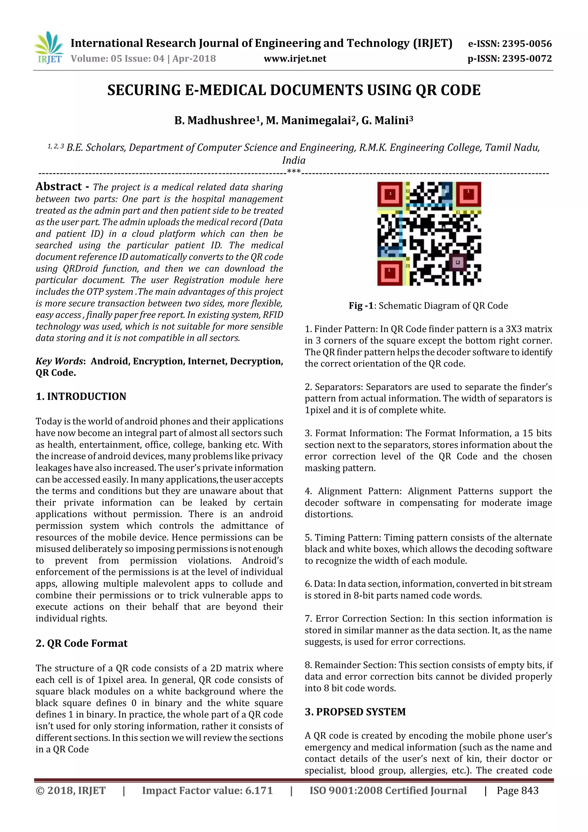 This document discusses securing e-medical documents using QR codes. It proposes a system where hospitals can upload medical records to the cloud with a patient ID. This ID is then converted to a QR code using the QRDroid function. Patients can then scan the QR code to download their medical document. The system aims to securely transmit medical data between hospitals and patients in a paperless manner using encrypted QR codes. It describes modules for user registration, database creation, QR code generation, scanning and file uploading/downloading. The goal is to provide a more secure, flexible and easy way for patients to access medical records electronically.