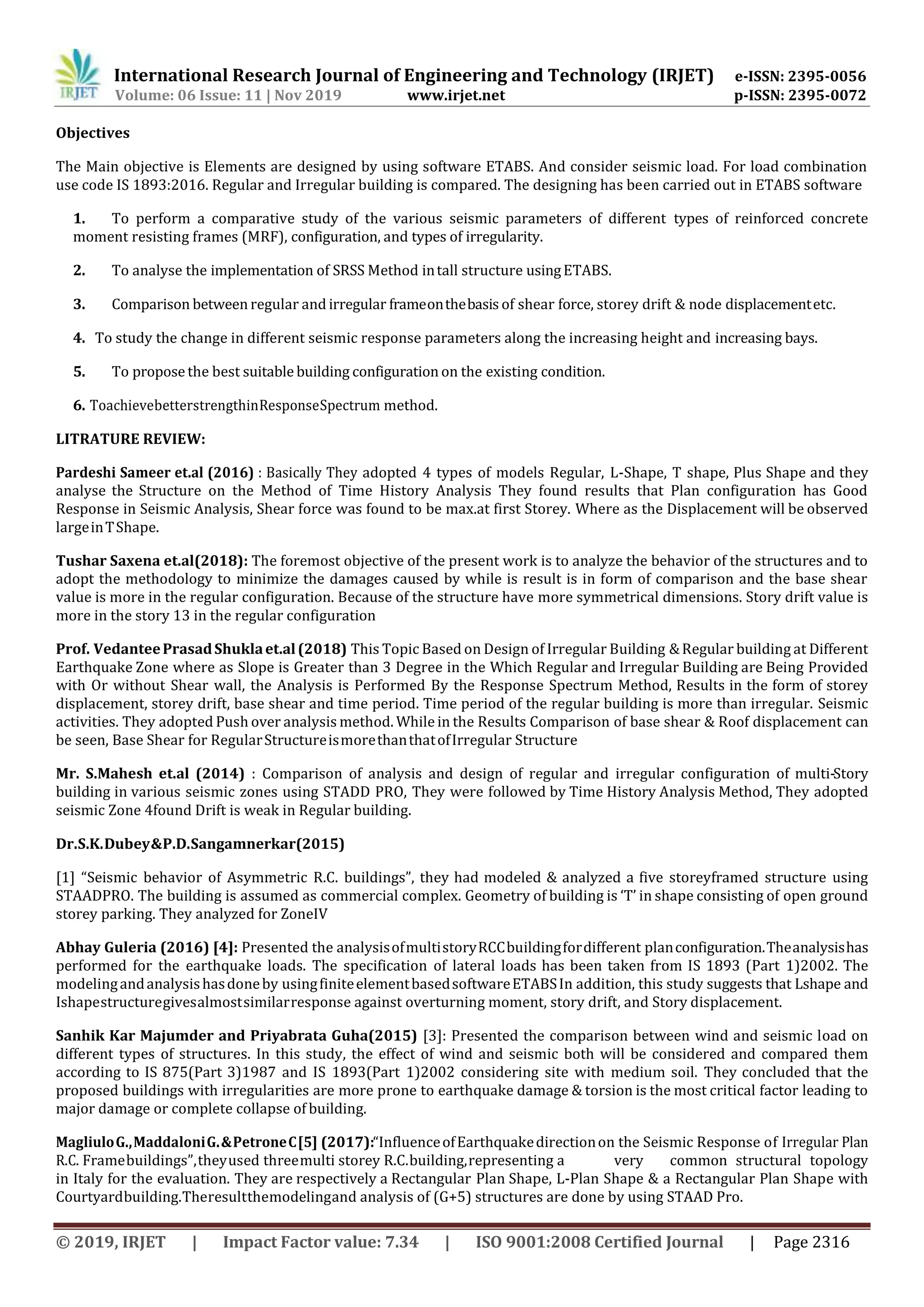 This document discusses seismic analysis of regular and irregular buildings using ETABS software. A 15-story reinforced concrete building model was generated for both regular and irregular configurations. Mass and stiffness distribution influence how multi-story buildings respond during earthquakes. Irregularities can cause damage as seen in the 2001 Bhuj earthquake in India. The objective is to conduct dynamic analysis of regular and irregular frames and compare results. Analysis considers factors like storey deflection, storey shear, and stiffness. Previous studies found plan configuration and symmetry affect seismic response, with irregular structures experiencing greater damage.