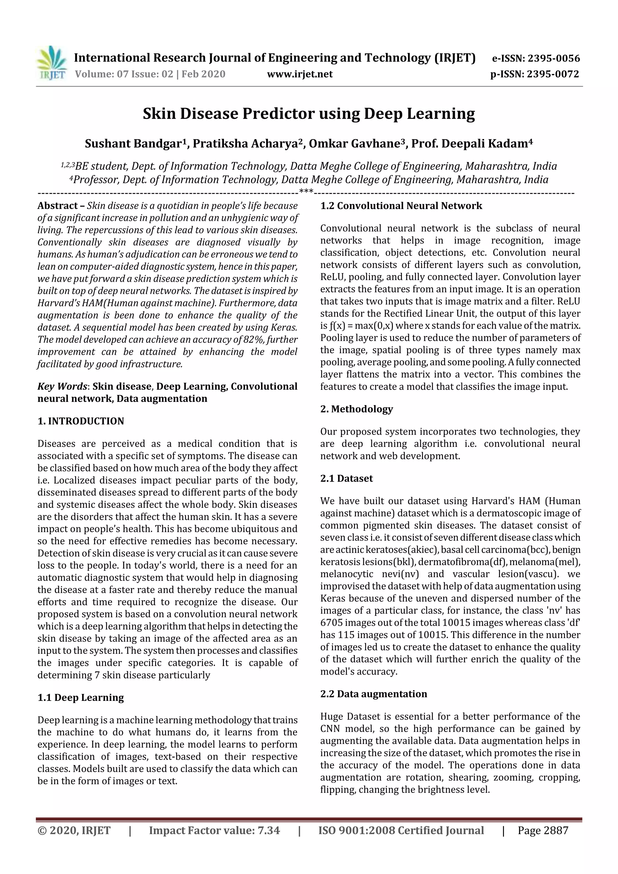 This document presents a skin disease prediction system built using a deep learning model. The system was trained on the Harvard HAM dataset containing images of 7 common skin diseases. Data augmentation techniques like rotation, shearing, zooming were used to improve the quality and size of the dataset. A convolutional neural network model with convolution, pooling, ReLU and fully connected layers was developed using Keras. The model achieved an accuracy of 82% and was integrated into a web-based user interface to allow users to upload images for disease prediction. Further improvements to increase accuracy require enhancing the model with more data and computational resources.