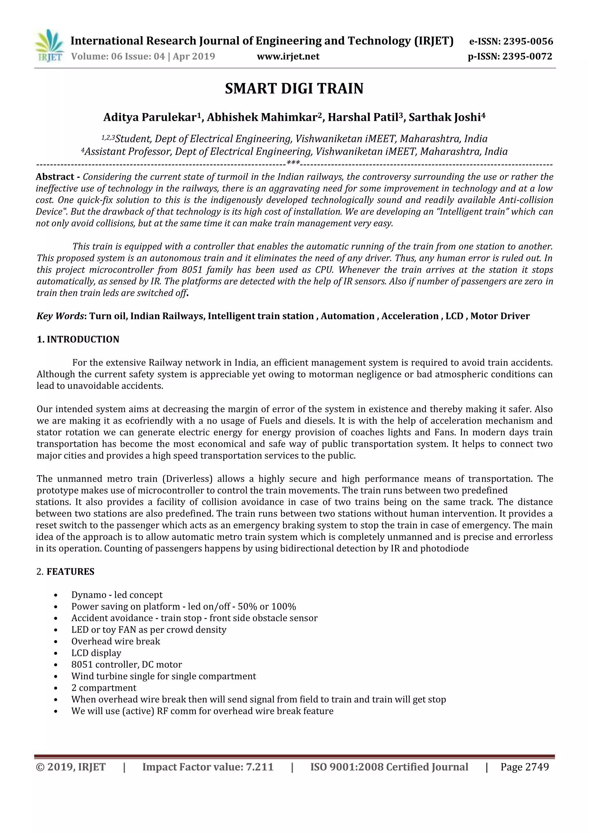 This document describes a proposed smart train system that aims to automate train operations to improve safety and efficiency. The system uses microcontrollers and sensors to allow trains to run autonomously between stations without human operators. It includes features like automatic stopping at stations using IR sensors, collision avoidance using obstacle sensors, and energy generation through dynamos or wind turbines. The system is intended to eliminate human errors to reduce accidents while making train management easier. A prototype was developed using an 8051 microcontroller, DC motors, sensors and other electronics to demonstrate the proof of concept. Experimental results showed that the automated lighting control on train platforms saved around 6 kWh of energy per day compared to conventional operation.