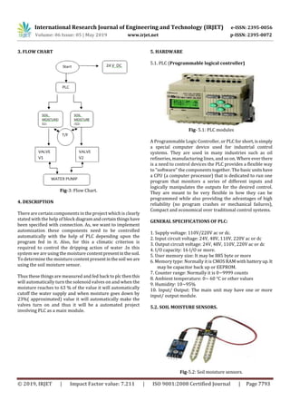 This document describes a smart irrigation system that uses soil moisture sensors and a programmable logic controller (PLC) to automate watering. The system aims to minimize water waste by only turning on pumps and supplying water when the soil moisture drops below a predefined threshold. Two sensors placed at different intervals will sense soil moisture levels and send data to the PLC. The PLC will compare the sensed values to the threshold and control solenoid valves and pumps accordingly to automatically supply water as needed based on soil dryness. The system is intended to provide the optimal required water to crops based on their demands and availability of electricity for pumping, reducing water consumption in agriculture through automation.