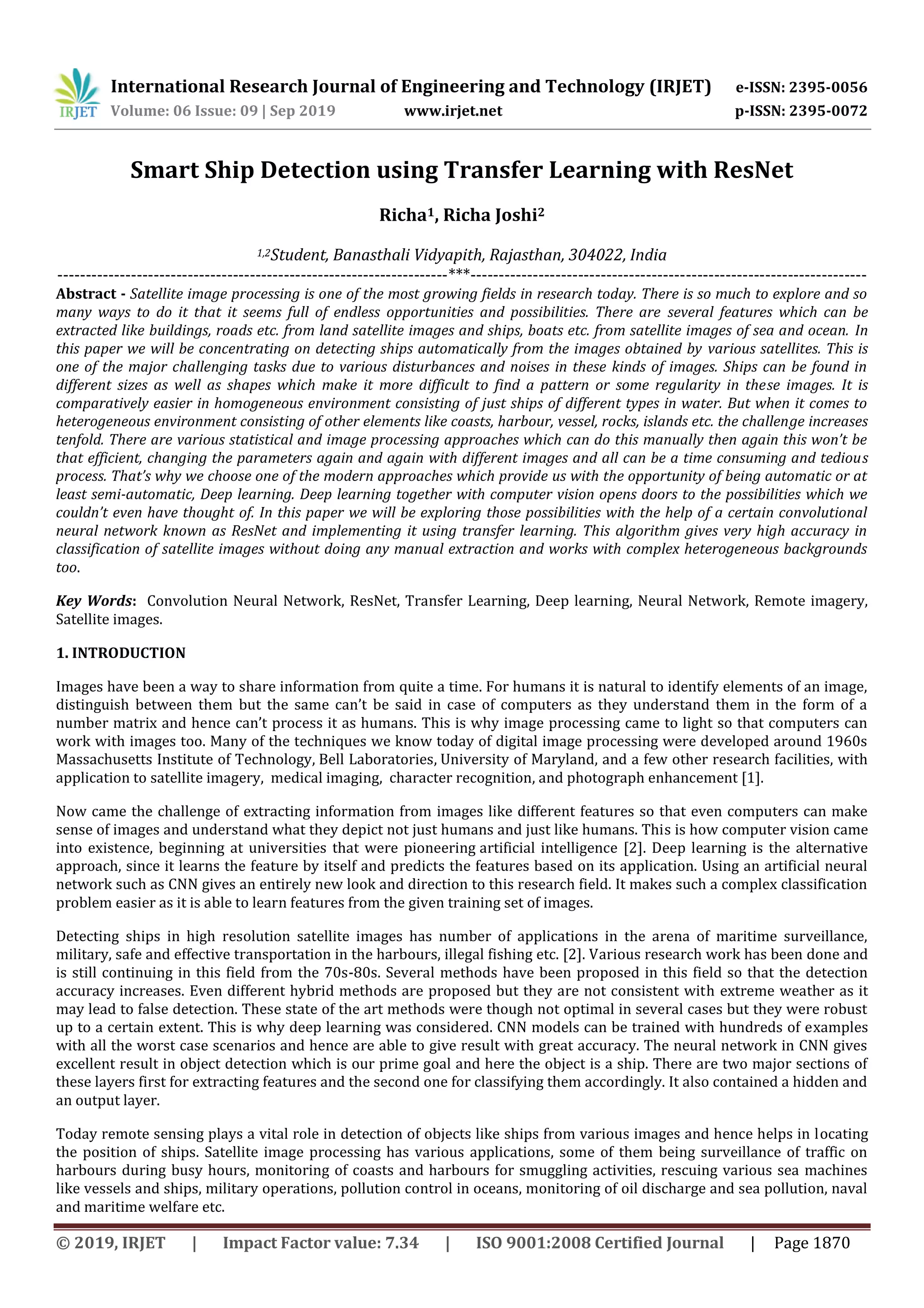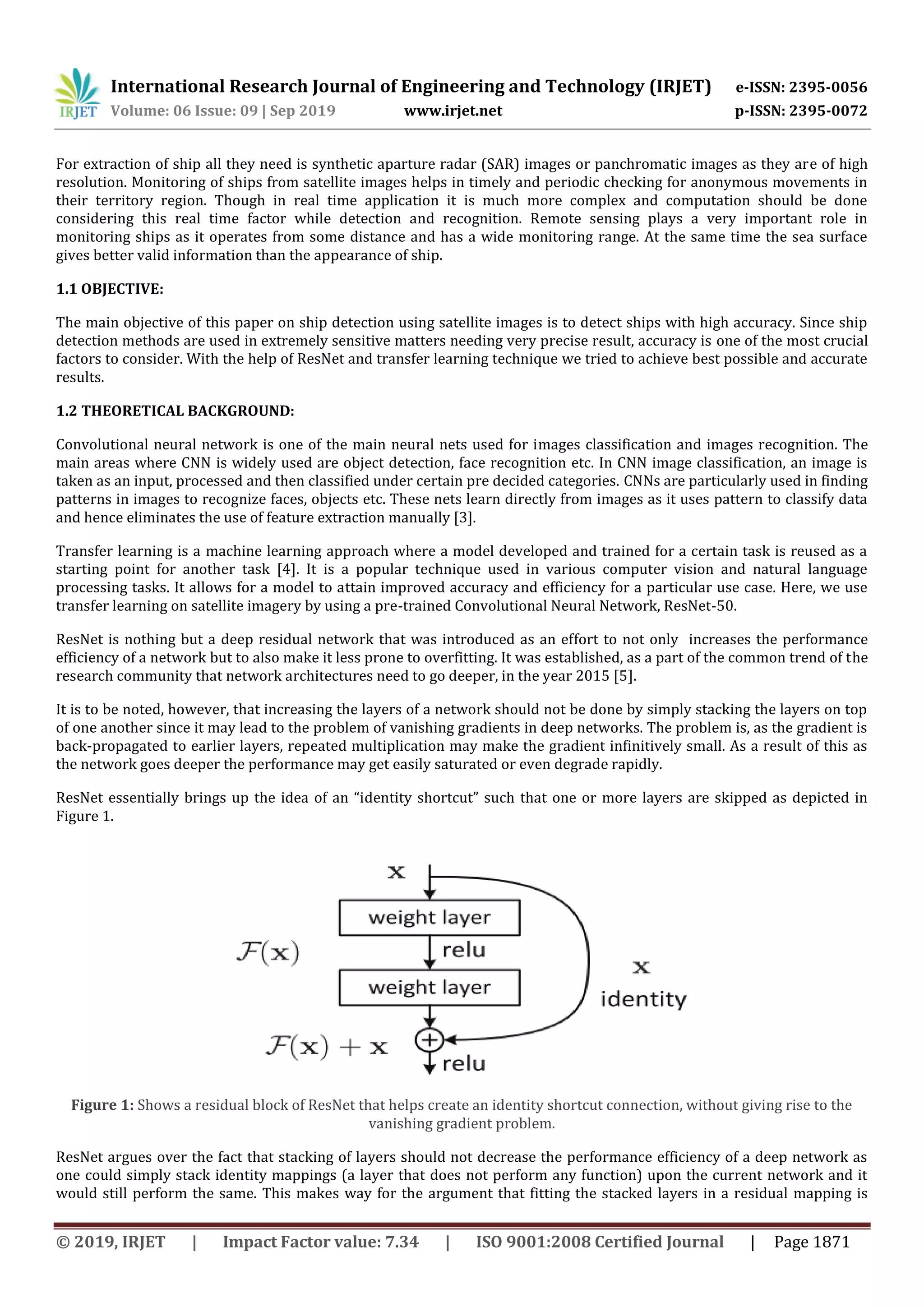 This document discusses using a convolutional neural network called ResNet with transfer learning to automatically detect ships in satellite images. ResNet is a deep residual network that can increase performance efficiency and reduce overfitting. The objective is to detect ships with high accuracy. Transfer learning is used to take a pre-trained ResNet-50 model and reuse it to classify satellite images into ship and non-ship categories, improving accuracy over traditional methods. Convolutional neural networks like ResNet are well-suited for this task as they can learn patterns directly from images without manual feature extraction.