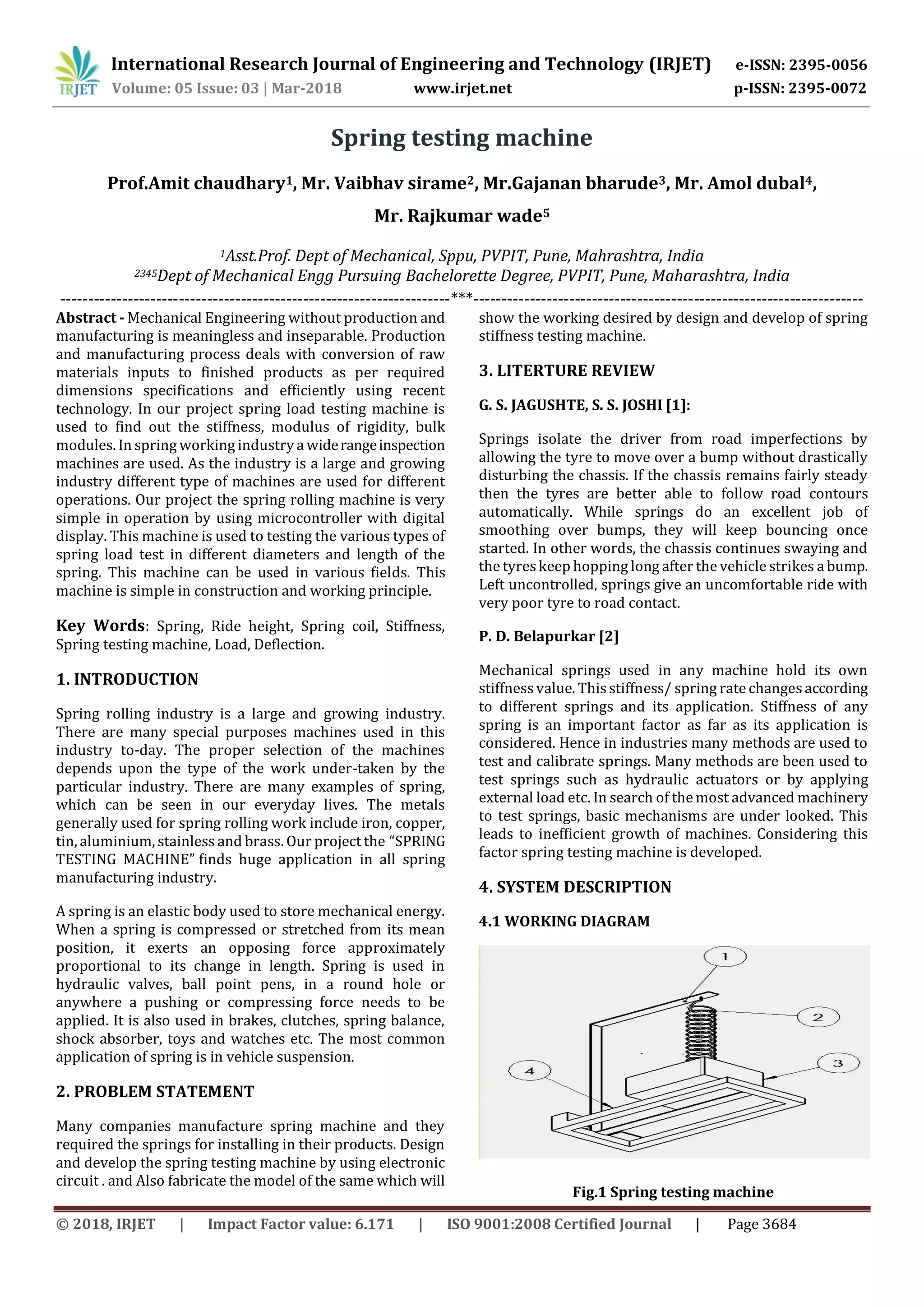 This document describes the design and development of a spring testing machine. The machine uses an ultrasonic sensor and microcontroller to apply varying loads to a spring and measure the resulting deflection. This allows the machine to test springs of different diameters and lengths and determine properties like stiffness. It provides an inexpensive and portable way for spring manufacturers and engineering students to evaluate spring characteristics. The system works by applying a weight to the spring and using the ultrasonic sensor and microcontroller to measure and display the deflection. This provides an automated method to test springs without complex or expensive equipment.
