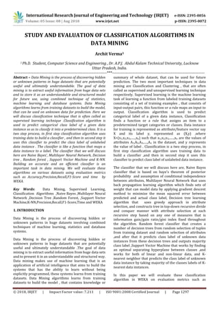 The document discusses classification algorithms in data mining. It describes classification as a supervised learning technique that predicts categorical class labels. Six classification algorithms are evaluated: Naive Bayes, neural networks, decision trees, random forests, support vector machines, and K-nearest neighbors. The algorithms are evaluated using metrics like accuracy, precision, recall, F1-score and time using the WEKA tool on various datasets. Building accurate and efficient classifiers is an important task in data mining.