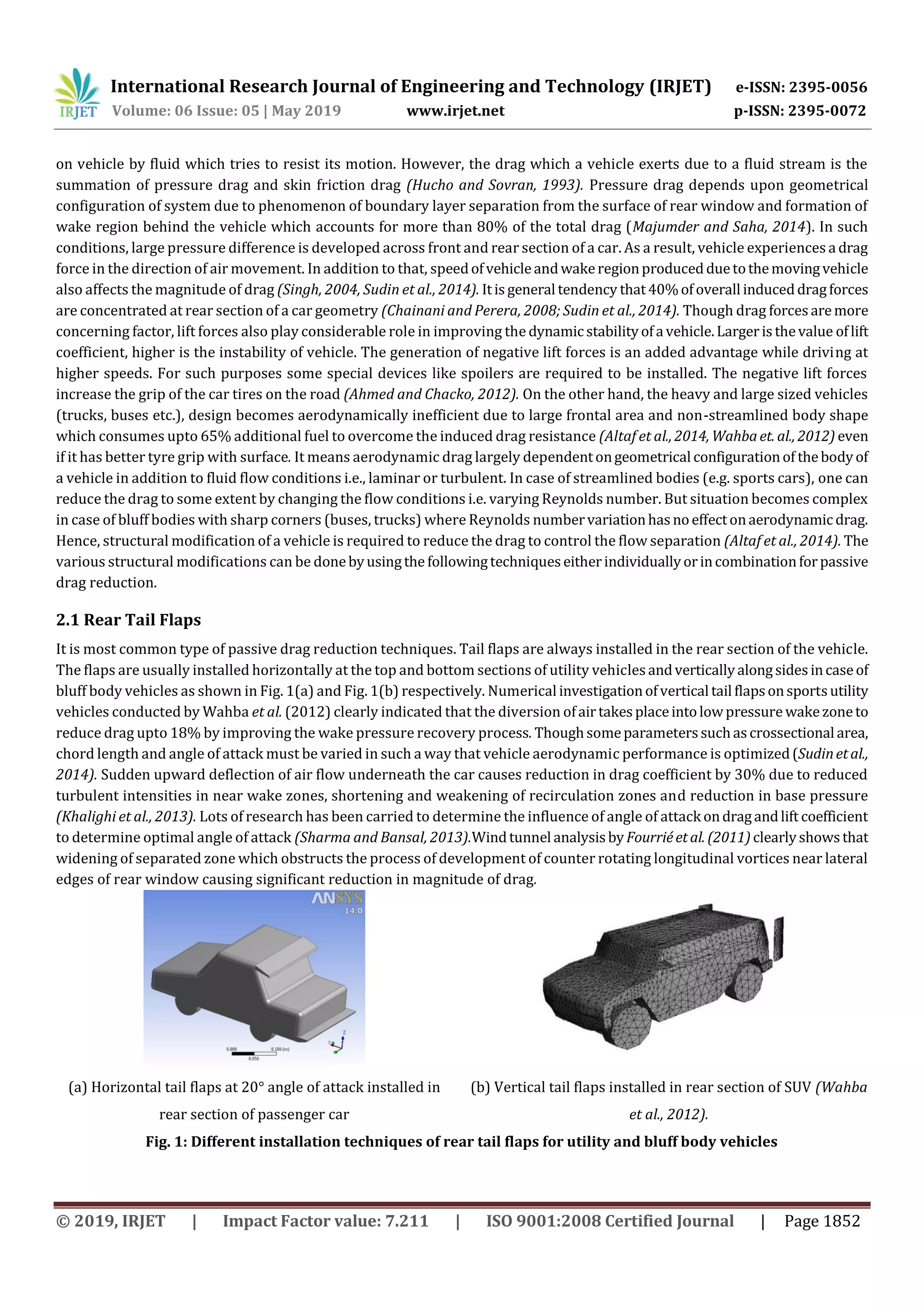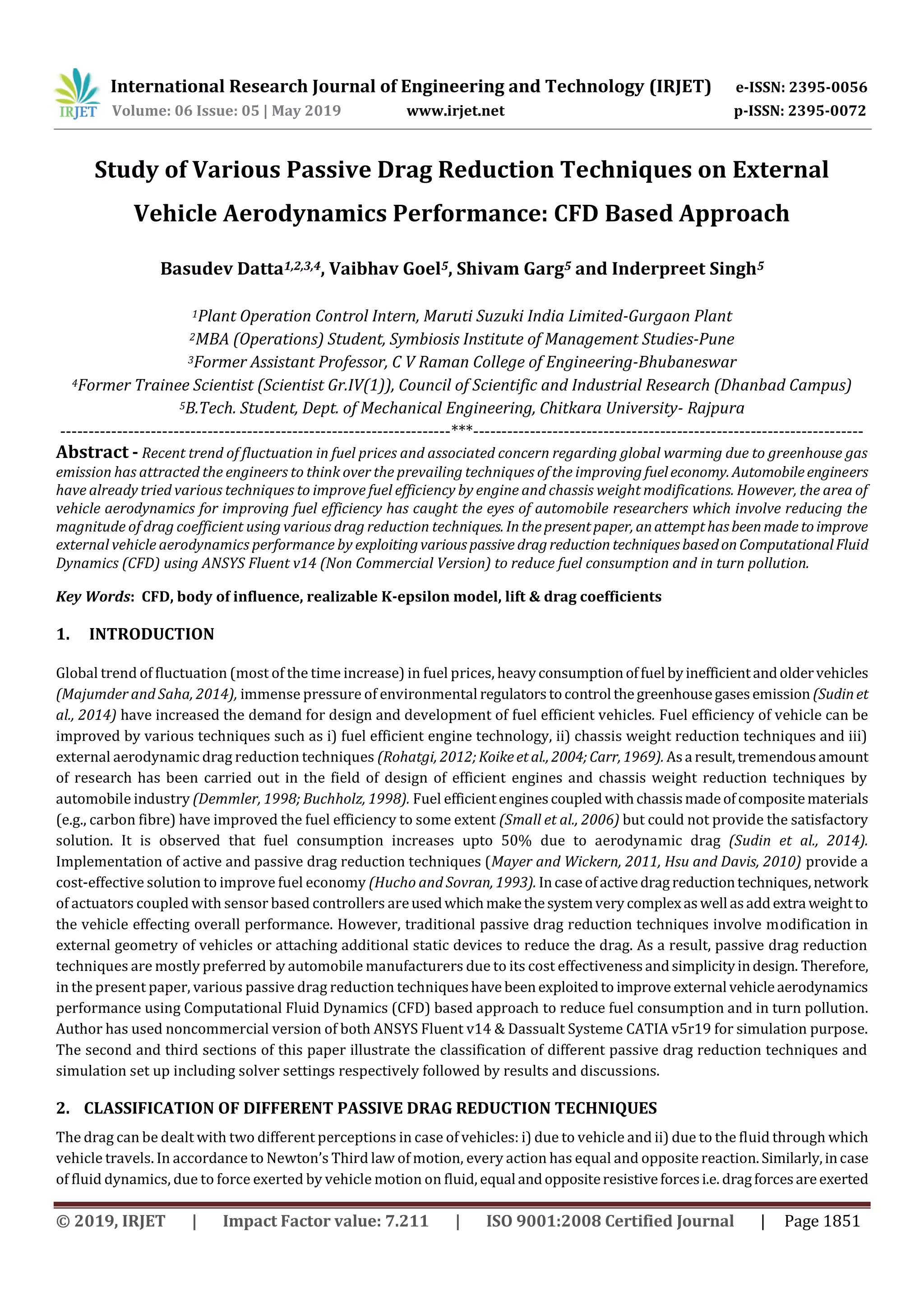 This document discusses various passive drag reduction techniques that can be used to improve vehicle aerodynamic performance through computational fluid dynamics (CFD) simulations. It classifies techniques such as rear tail flaps, ground effect modifications, diffusers, vortex generators, front bonnet ducts, rear spoilers, and rear fairings. The document provides examples of each technique and references studies showing how they can reduce drag coefficients and improve fuel efficiency when applied to vehicle models in CFD simulations.