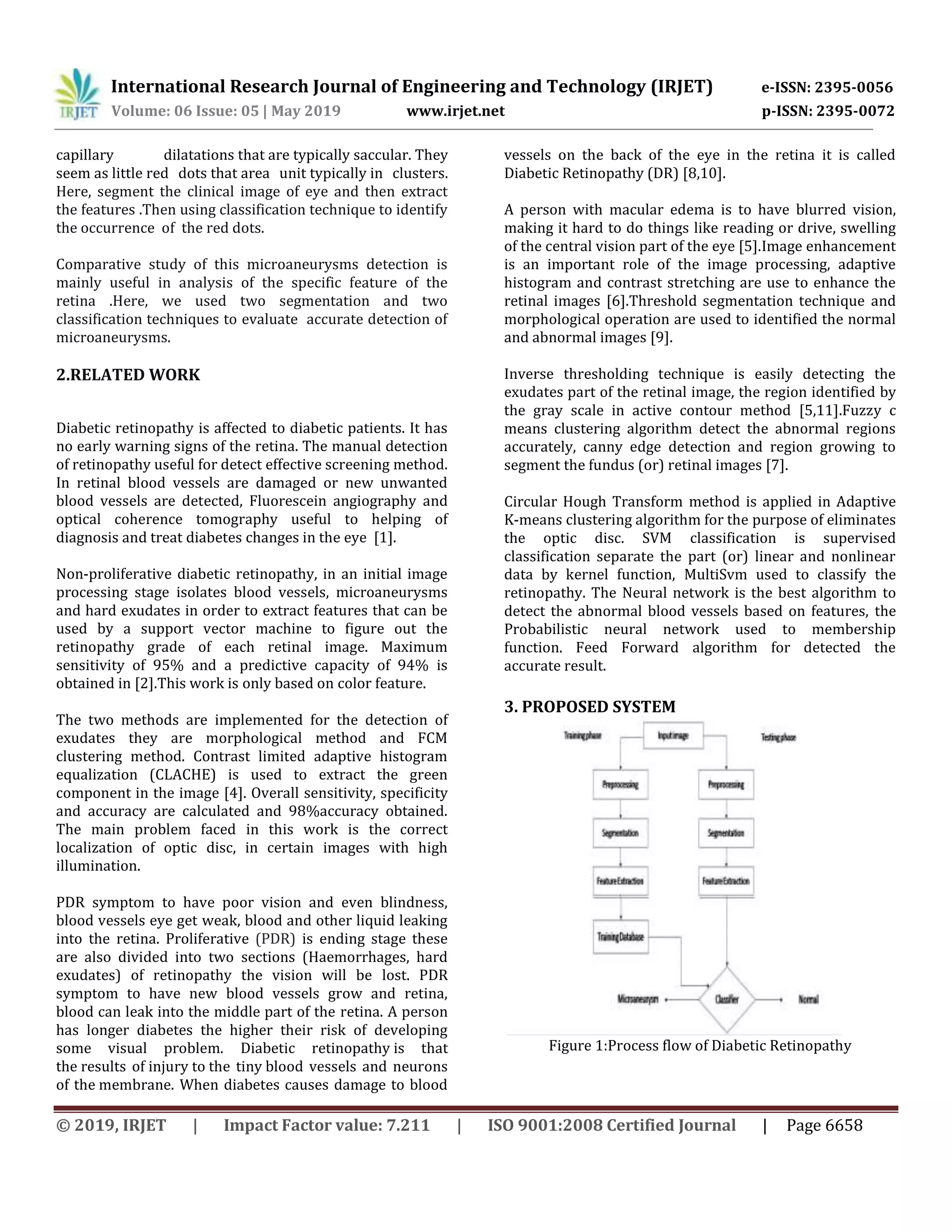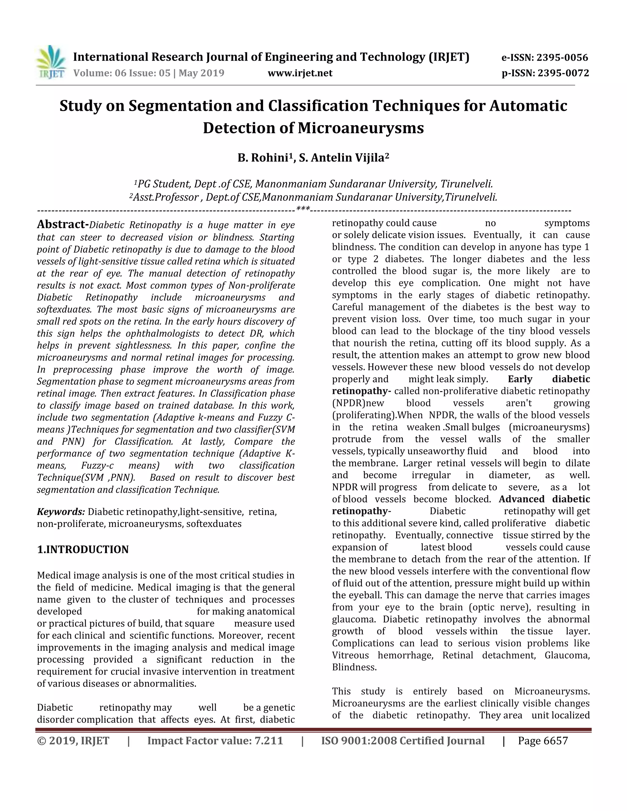This document discusses techniques for the automatic detection of microaneurysms, which are small red spots that are early signs of diabetic retinopathy. It proposes using image segmentation and classification methods on retinal images to identify microaneurysms. Specifically, it compares the performance of adaptive k-means clustering and fuzzy c-means segmentation, as well as support vector machine (SVM) and probabilistic neural network (PNN) classification. The document provides background on diabetic retinopathy and microaneurysms. It also reviews related work on segmentation and classification methods for detecting lesions in retinal images.