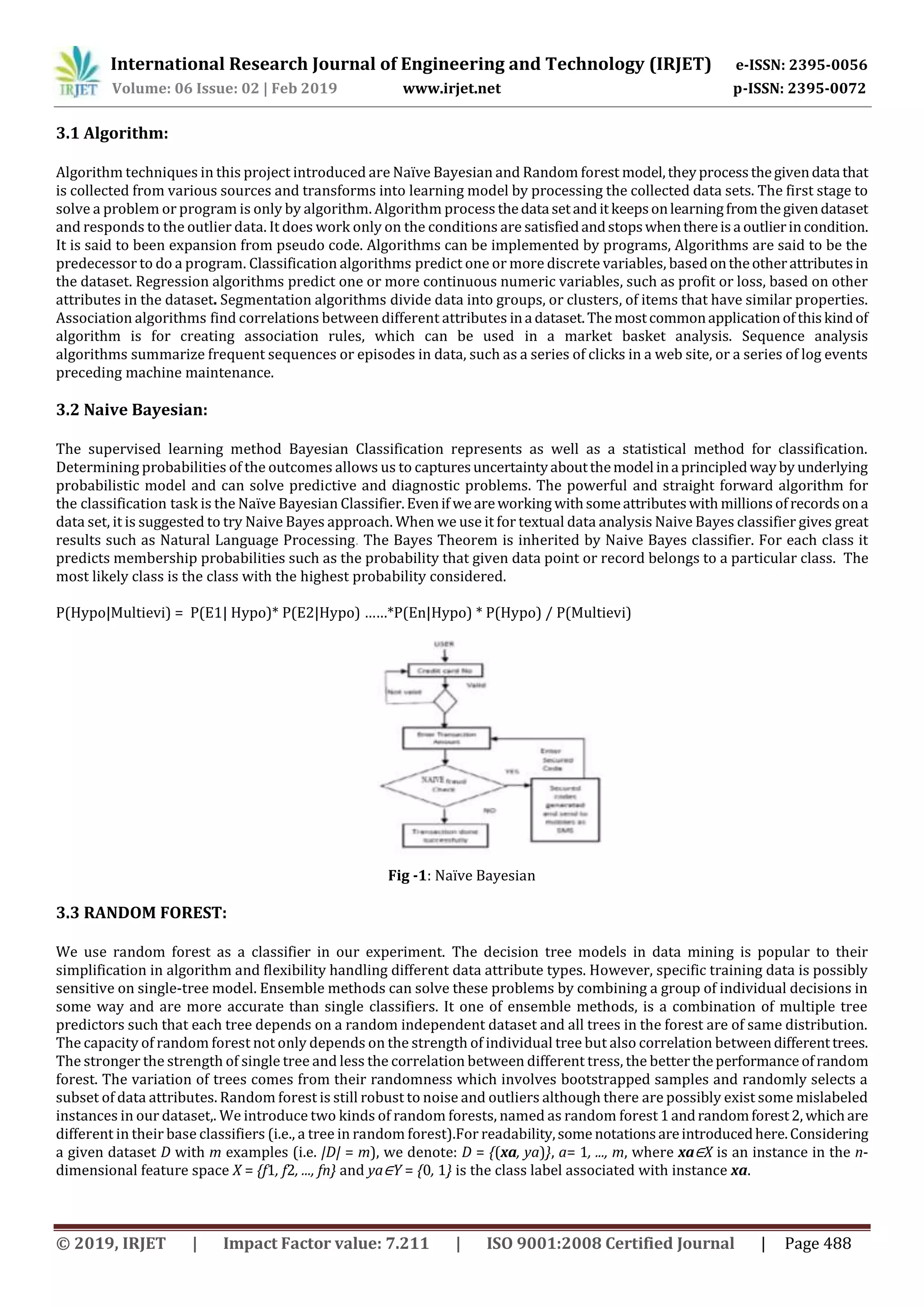 This document summarizes a research paper that proposes a credit card fraud detection system using machine learning algorithms like Naive Bayes and Random Forest. It begins with an abstract describing the use of these classification algorithms on credit card transaction data to model past transactions and identify fraudulent ones. Then, it provides background on the increasing problem of credit card fraud and motivates the need for this research. It describes the Naive Bayes and Random Forest algorithms and evaluates their performance on this fraud detection task. Finally, it reviews related work applying machine learning to credit card fraud detection and discusses the results.