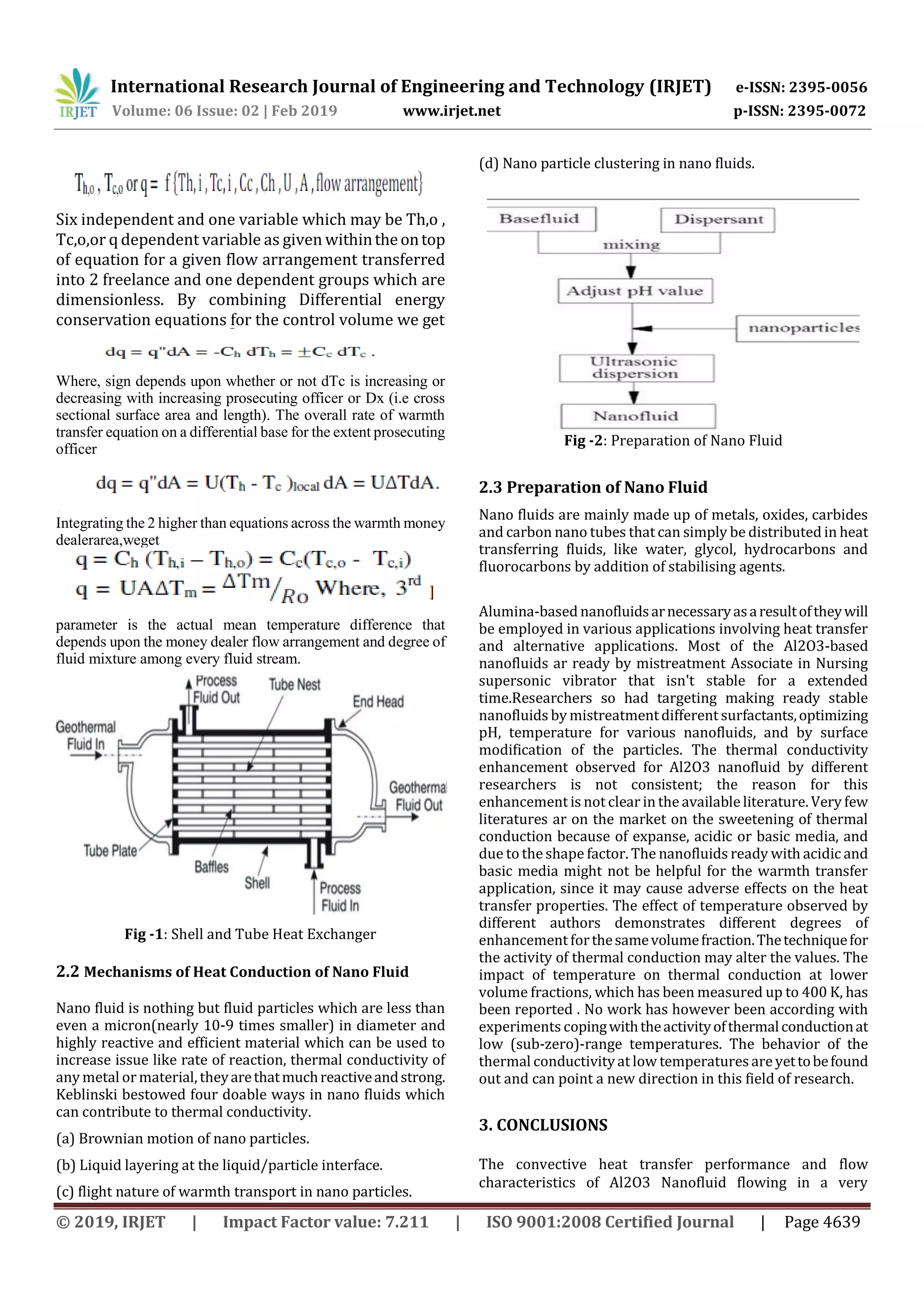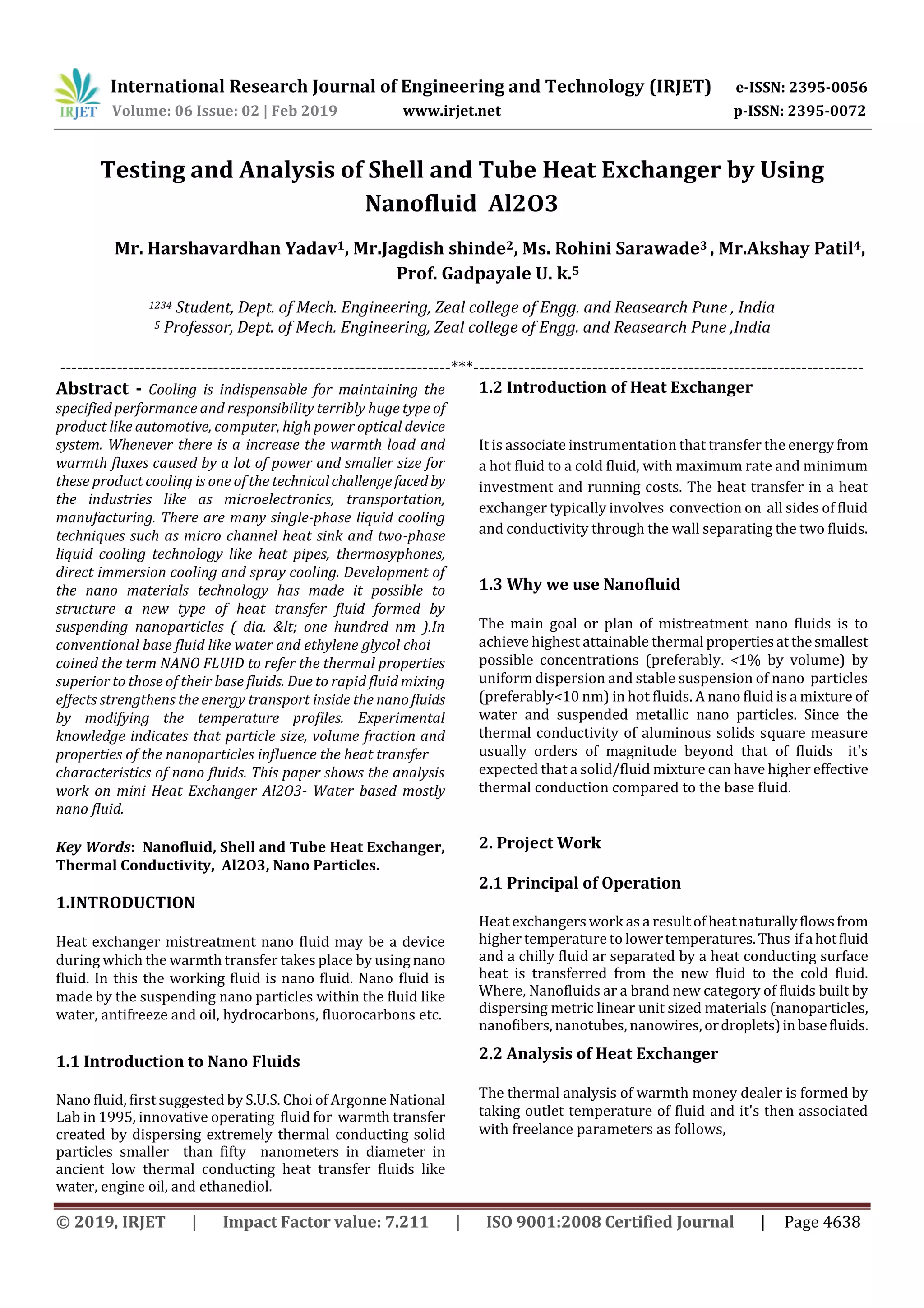 This document discusses testing and analysis of a shell and tube heat exchanger using an alumina-water nanofluid. Key points include: