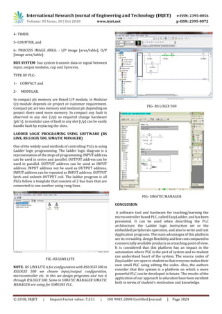 This document discusses programmable logic controllers (PLCs) and their use in industrial automation. It begins with an abstract that outlines how PLCs are widely used to control industrial machines and presents experiments for students to learn about various PLC applications. The next sections describe the basic components of a PLC system, including input/output modules, the central processing unit, and programming software. Ladder logic programming is discussed as a common method to control PLCs. The document concludes that the presented educational approach on PLCs is effective for teaching students about industrial automation and control systems.