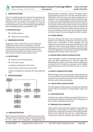 This document proposes an effective and secure e-voting application using biometrics for user authentication. The system would allow authorized users to cast their votes using their mobile phones, addressing limitations of traditional in-person voting. Fingerprints and RFID would be used to verify voters' identities and prevent duplicate voting. The votes would be securely transmitted through an IoT network and tabulated in real-time, allowing election results to be announced on the same day. This could help increase voter turnout by allowing remote voting while maintaining security through multi-factor authentication.
