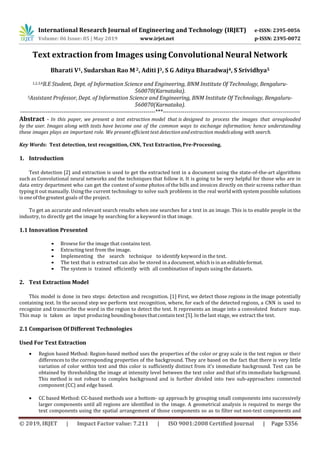 The document describes a text extraction model that uses convolutional neural networks (CNNs) to detect and recognize text in images. It discusses pre-processing techniques like binarization and filtering used to improve accuracy. A CNN based on ResNet18 architecture is used for text recognition, trained with CTC loss to handle variable-length text. Keywords can be searched for in extracted text and highlighted. The system allows browsing images, extracting text, searching text, and storing extracted text in an editable document format. While current technology can extract text from simple backgrounds, this model aims to handle more complex real-world images.