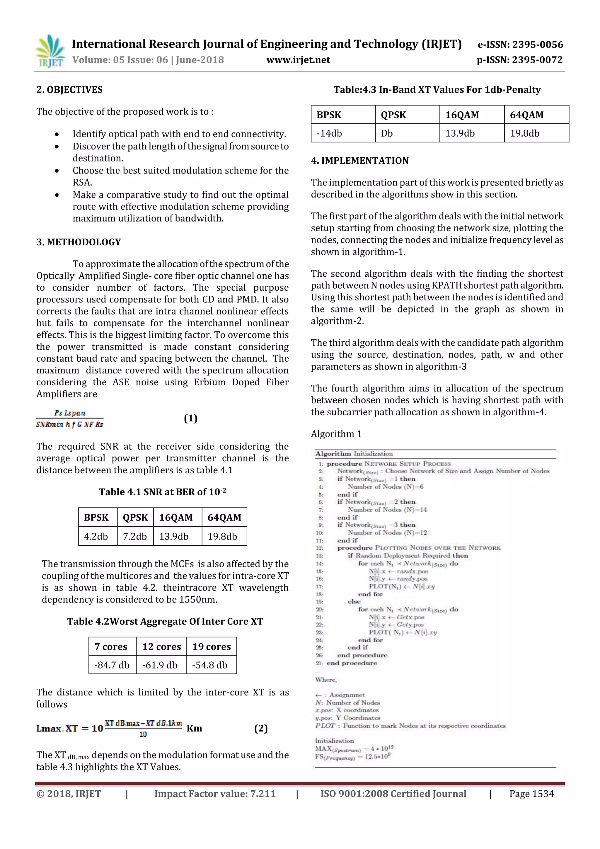 This document discusses spectrum allocation policies for flex grid networks with data rate limited transmission. It begins with an abstract that outlines the tradeoff between data rate, allocated frequency slots, and modulation format that must be considered for spectrum allocation. It then discusses the objectives of identifying optical paths, path lengths, selecting modulation schemes, and finding optimal routes. The methodology section covers factors considered for spectrum allocation like modulation formats, noise, crosstalk, and transmission distances limited by noise and crosstalk for different modulation formats and fiber core counts. Implementation details algorithms for network setup, finding shortest paths, candidate path selection, and spectrum allocation. Results show fragmentation increases with demand but is constant for some core fibers. Higher core counts provide advantages and lower request