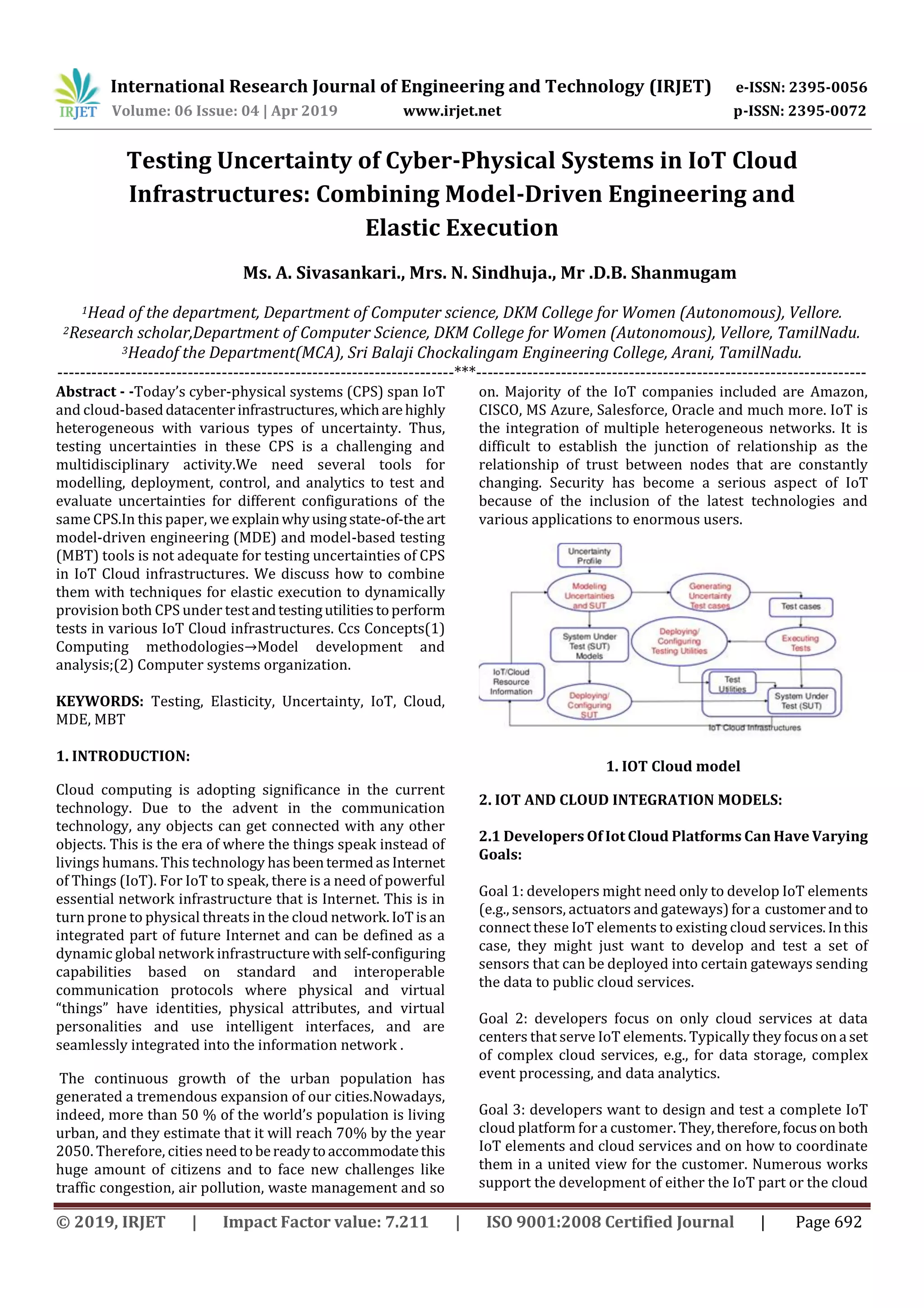 This document discusses testing uncertainties in cyber-physical systems (CPS) that span Internet of Things (IoT) and cloud infrastructures. It proposes combining model-driven engineering and elastic execution techniques to dynamically provision both the CPS under test and testing utilities across various IoT and cloud infrastructures. Specifically, it suggests using software-defined IoT units and cloud-based elastic services that can be composed, controlled via APIs, and provisioned elastically to enable testing CPS configurations and behaviors across heterogeneous environments.